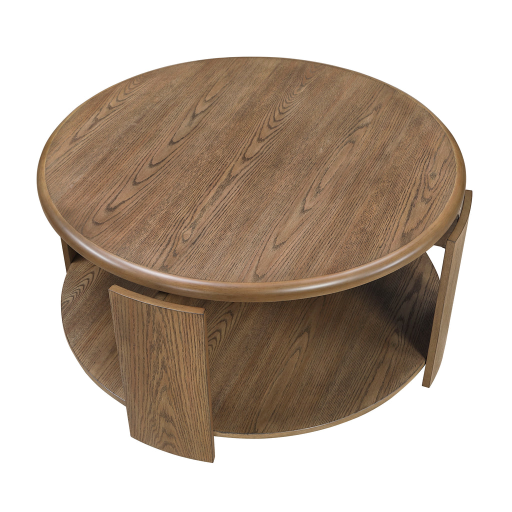 Reinvent your living space with this innovative and stylish round coffee table. Featuring a unique swivel top, this piece effortlessly expands to create more surface area when you need it and neatly tucks away when you don't. The rich brown finish and beautiful oak veneer bring a warm, rustic modern aesthetic to any room, while the convenient open lower shelf provides a perfect spot for books and decor. Equipped with smooth-rolling casters, this mobile cocktail table can be easily moved and rearranged for movie nights, entertaining guests, or simple cleaning. It’s the ultimate blend of versatile design and smart functionality for your living room, den, or family room.