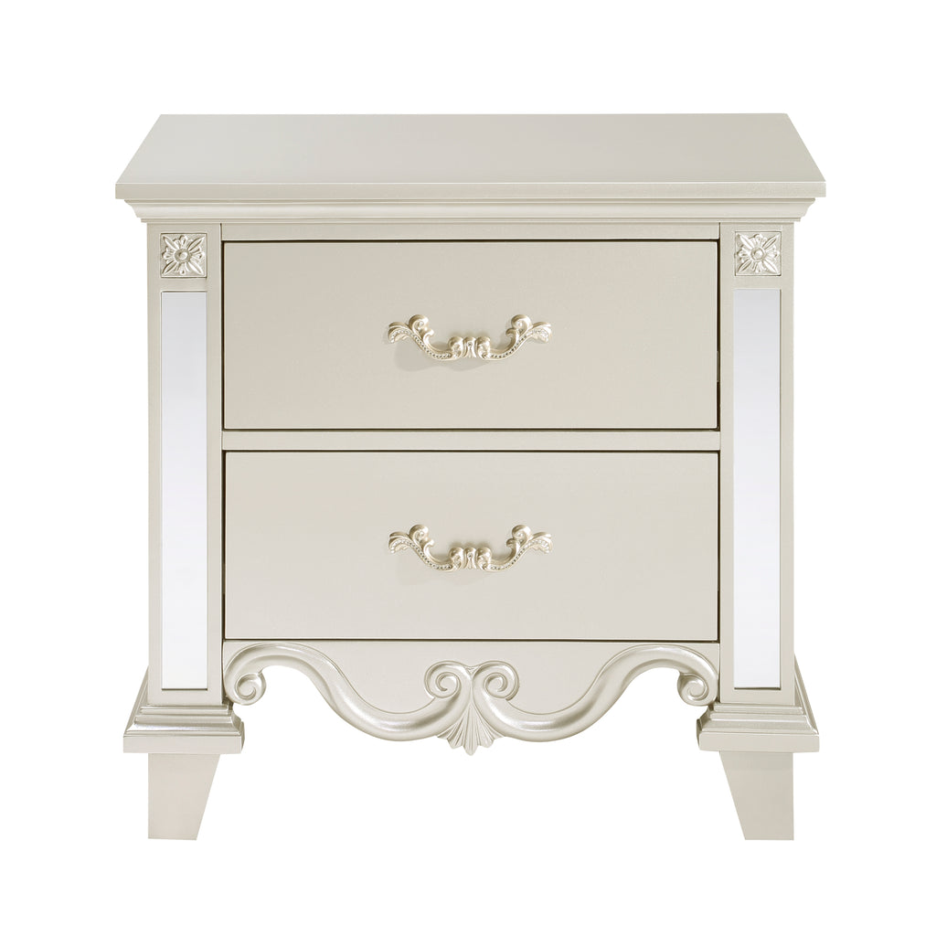 Traditional accenting is elegantly paired with glamorous flair to create the look of the Ever Collection. A champagne finish covers the nightstand with mirror accent framing providing a reflection of your inspired design. Scrollwork and routing provide classic detail.