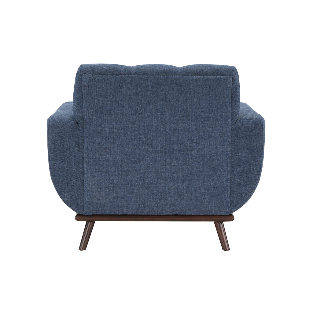 Mid-Century Modern inspired design comprises the timeless look of the Everton Collection. Blue chenille covers the modern framed chair with a geometric print toss pillow, walnut-finished wood base rail and legs providing complementing accent to the group. Contour stitching lends scalloped detail to the seatback’s profile, and front, while the prominent framing of the collection’s arms solidifies the retro-inspired form. The collection also features reversible seat cushions. 41.5 x 35 x 37H