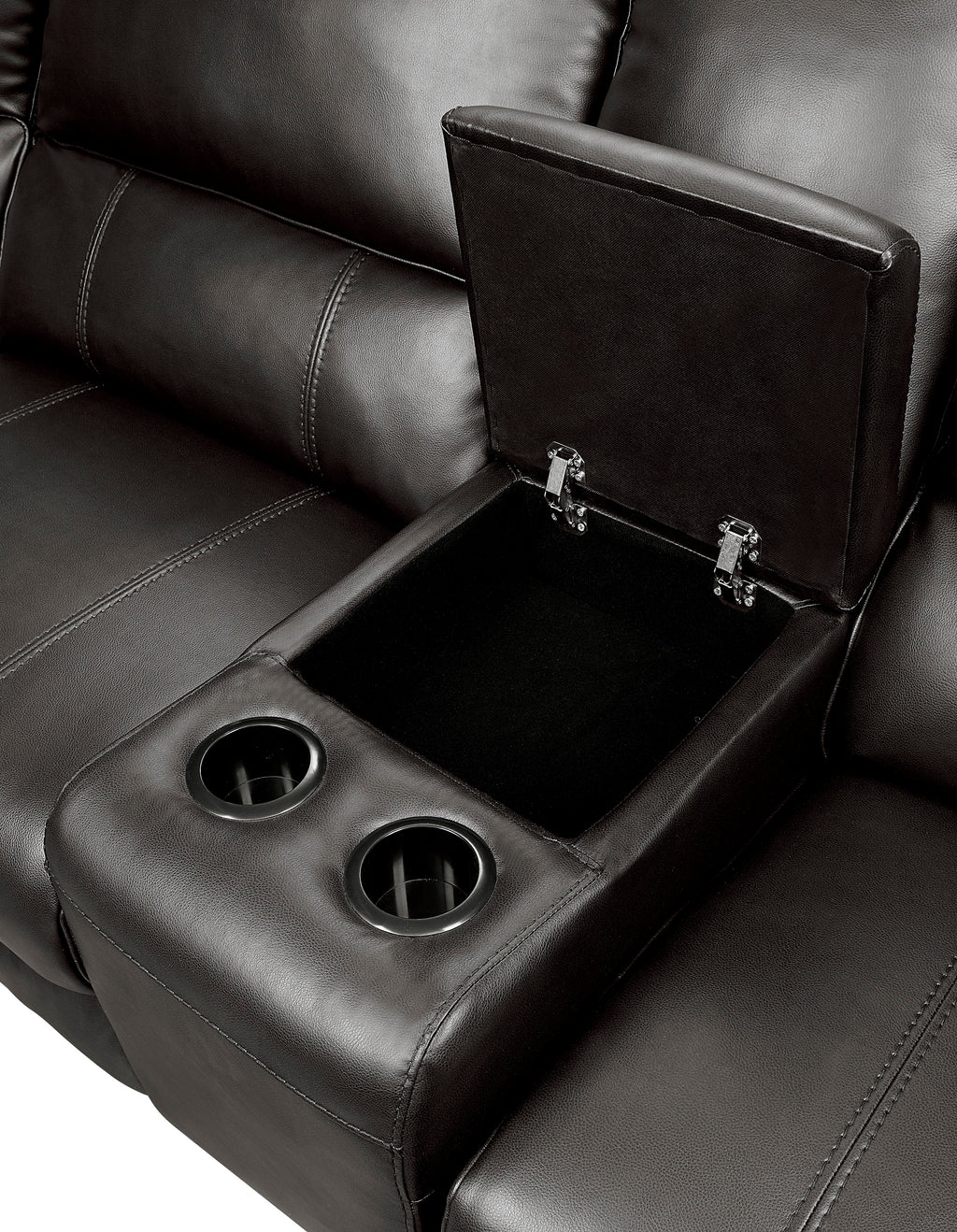 Modern convenience paired with comfort and style create the perfect seating option for your home with the Falun Collection. Dark brown faux leather cover. Power reclining mechanisms are engaged with the push of a button, taking you from seated to prone in one gentle motion. Further functionality comes in the form of the side-mounted USB port and cup holder console. 135.5 x 119.5 x 39H