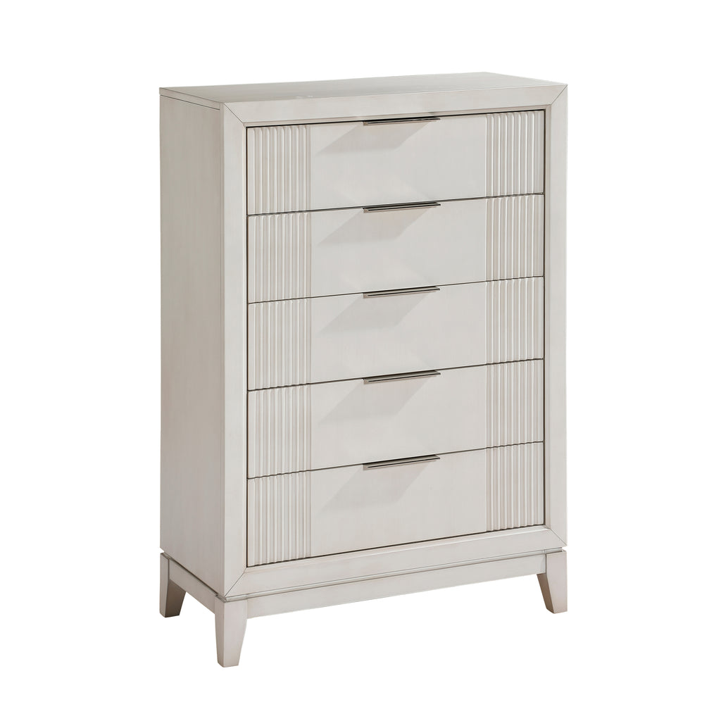 Subtle modern accenting inspires the classic design of the Florence Collection, each element pairing to create a visually appealing look for your bedroom. Reeded accenting fronts the drawers of the chest. Polished chrome edge-pull hardware centers each drawer front. The antique white finish of the collection lends a refreshing hue to your room’s décor.