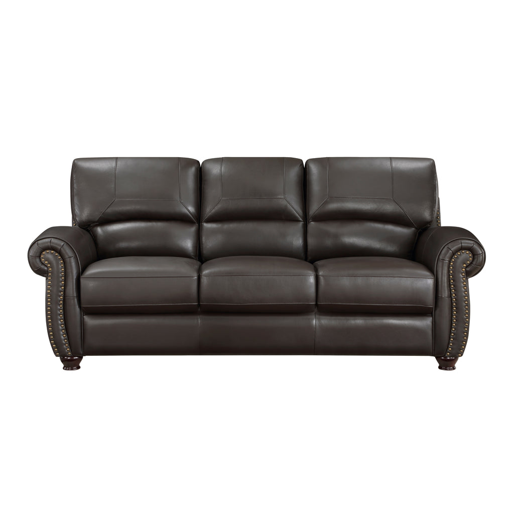 Traditional design and classic accents are paired to create the timeless look of the Foxborough Collection. Dark brown top-grain leather covers the plush seating of the sofa everywhere the hand touches – with faux leather match covering the remaining areas. The profile of the seating arrangement is defined by elegantly rolled arms, plush seatbacks, and nailhead trim.