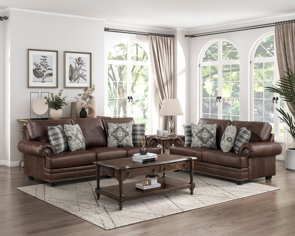 With a refined look that is steeped in traditional design, the Franklin Collection provides a timeless elegance to your living room. Dark brown polished microfiber covers the frame of the sofa while traditional rolled arms, and nailhead trim provide classic detail to profile of the sofa. Contrasting toss pillows solidify the look, the floral and plaid designs an elegant pairing to complement your space.