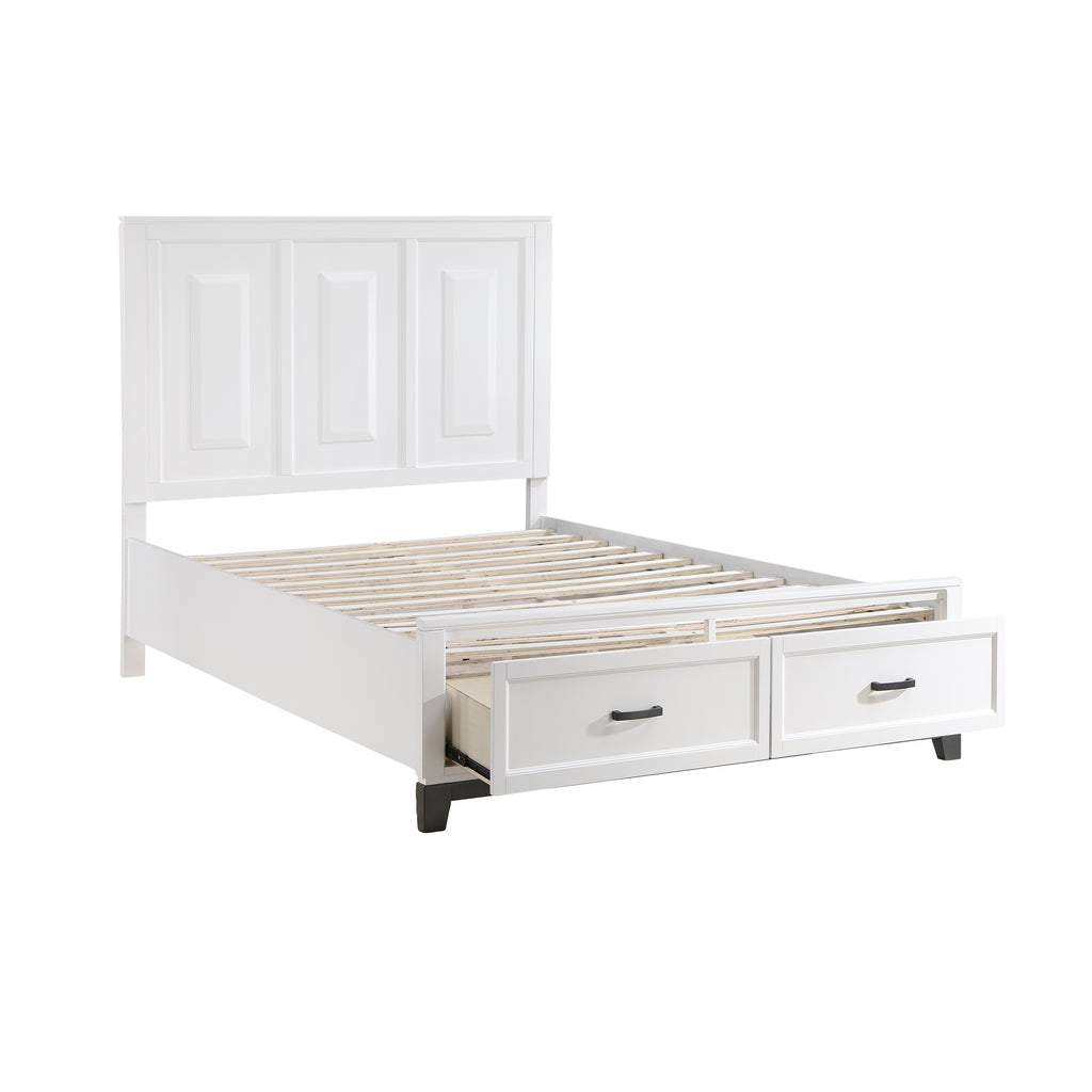 The Garretson Collection blends transitional lines with rustic styling to create an elegant addition for your bedroom. The queen bed features a white finish and metal bar hardware on the picture frame drawer fronts of the low-profile storage footboard, the two drawers creating additional space within your room for soft good storage. 63.5 x 84.5 x 57.5H