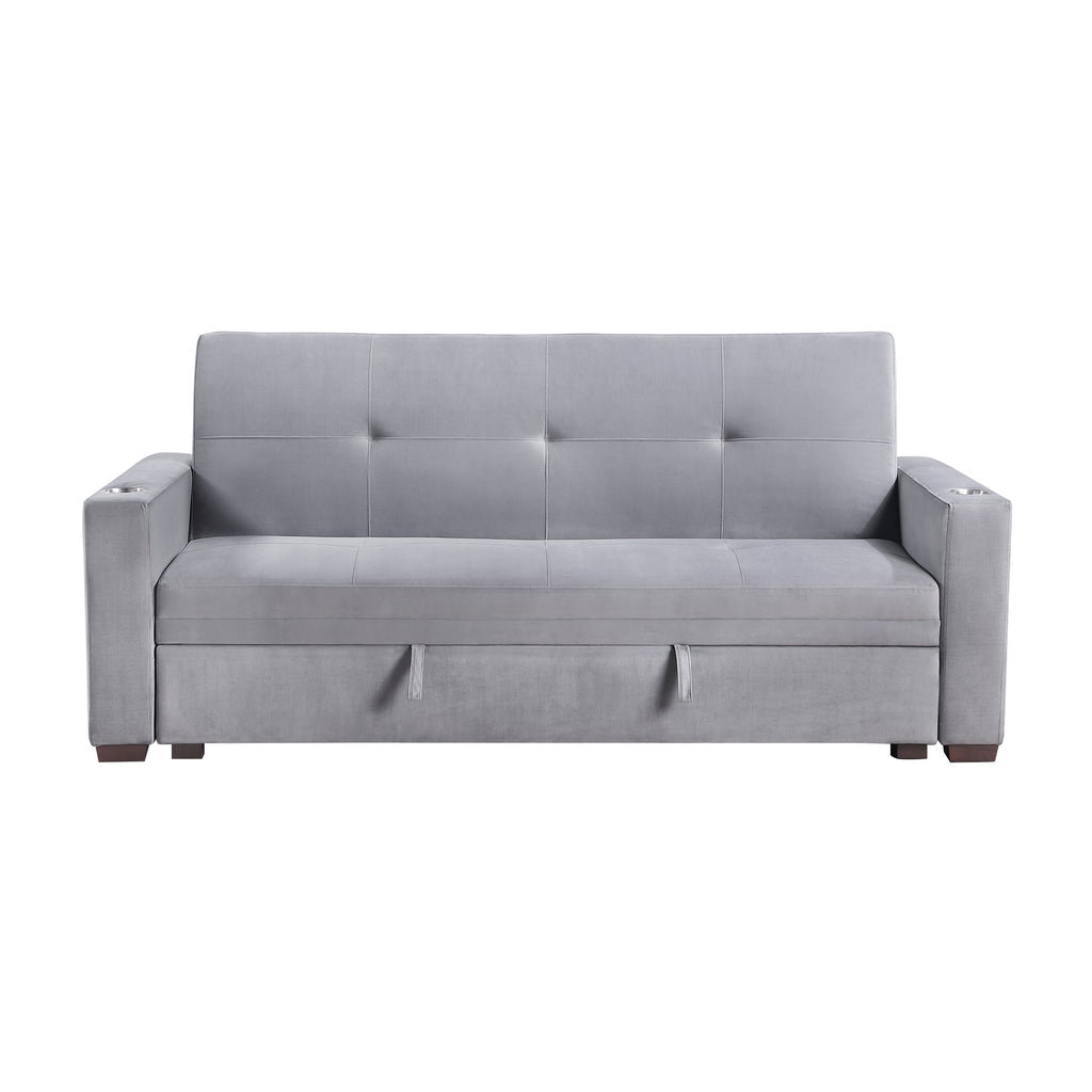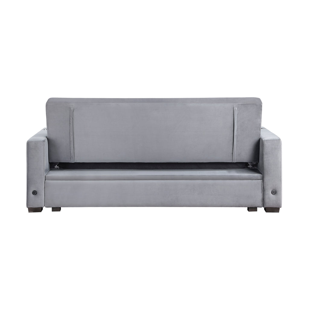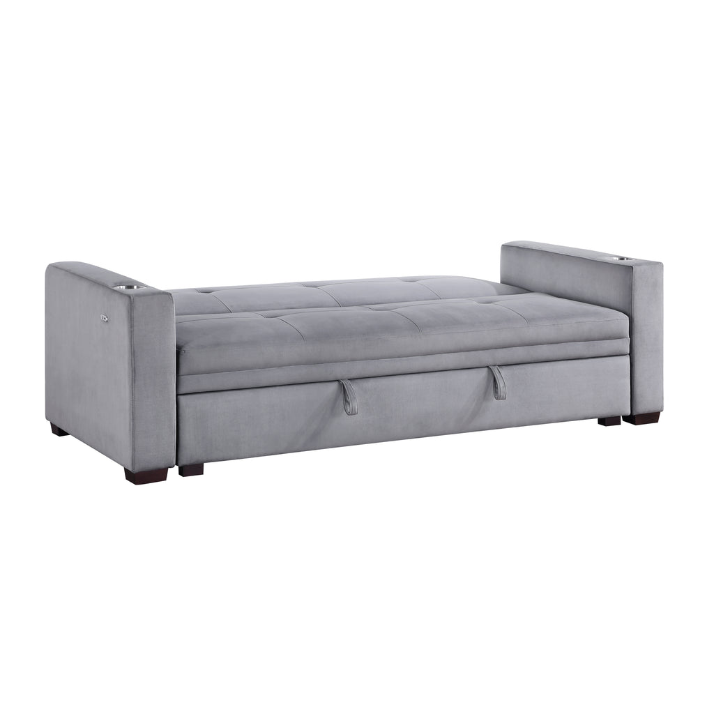 The Grady Collection allows for ease of expansion of your seating area to sleeping platform, with the engagement of the click-motion seatback and pop-up bed. Gray velvet covers the seating group, providing a soft touch to the modern frame of the sofa. Cupholders are mounted on the sofa’s arms for ease of access to your beverages.