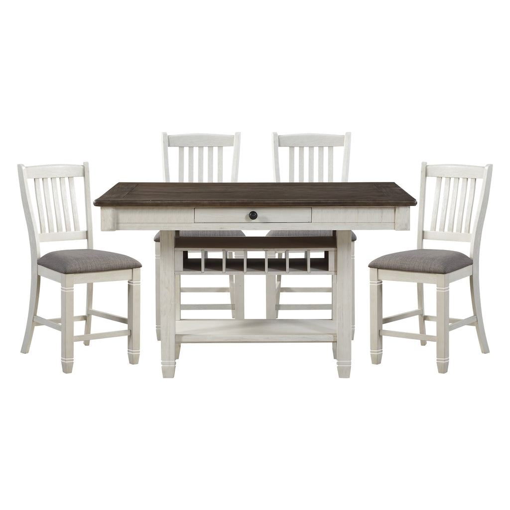 Inspired by the aesthetic of a casual country kitchen, the Granby Collection is an inviting gathering spot for mealtime with family and friends. 36-inch counter height with 4 drawers on the apron and storage display shelf base. The two-tone look of the acacia and pine solids base, finished in antique white, and the elm veneer of the table’s top, finished in a rosy brown, present as a harmonious combination of color. Also available for the 72-inch table – side chair, bench and server. None