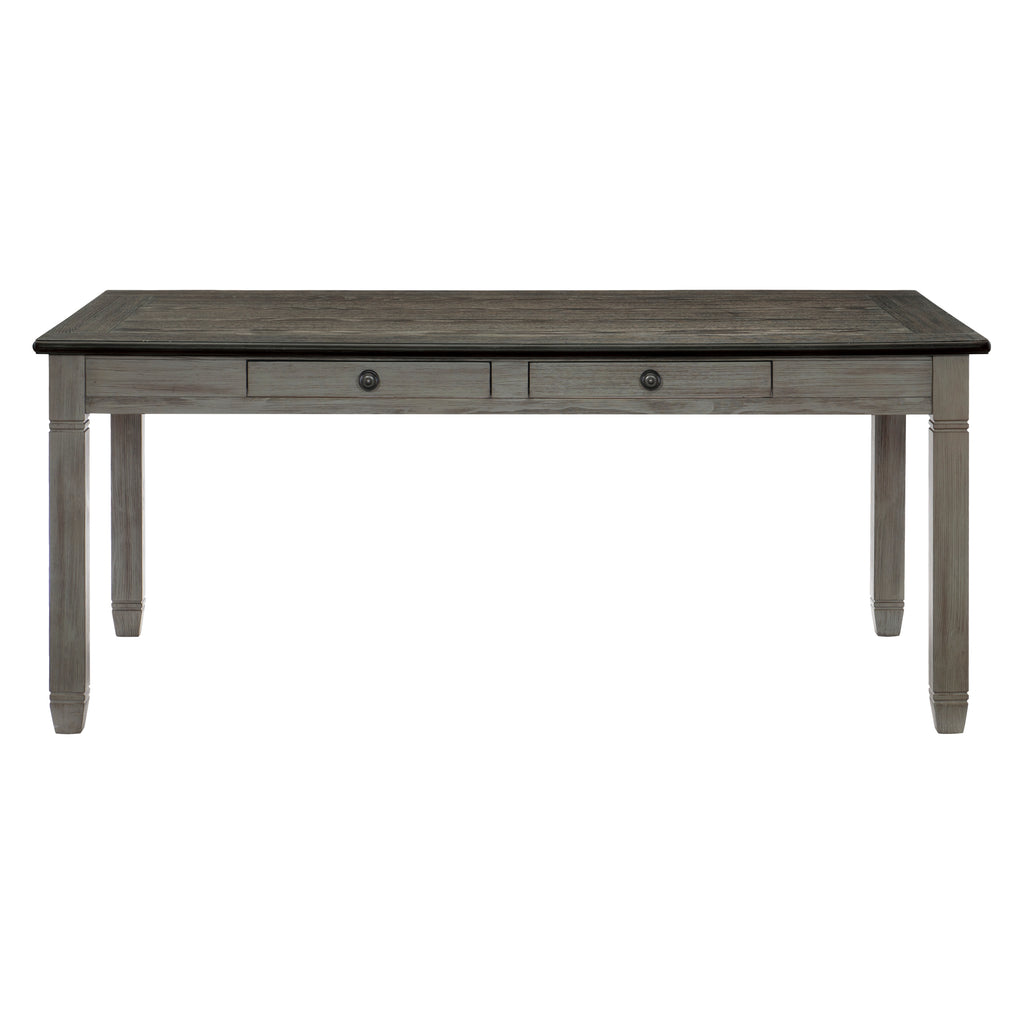 Inspired by the aesthetic of a casual country kitchen, the Granby Collection is an inviting gathering spot for mealtime with family and friends. The 72-inch dining table features 6 drawers on the apron. The two-tone look of the acacia and pine solids base, finished in antique gray, and the oak veneer of the coffee-finished tabletop, present as a harmonious combination of color, perfect for your home. The drawers on the table apron feature dark metal knob hardware.