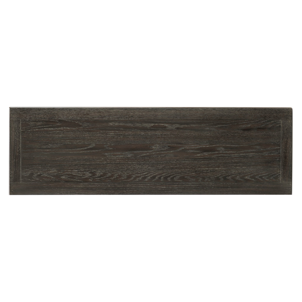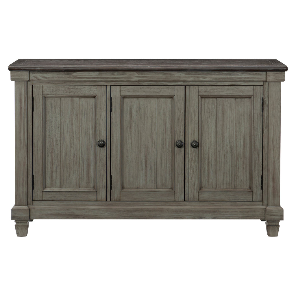 Inspired by the aesthetic of a casual country kitchen, the Granby Collection is an inviting gathering spot for mealtime with family and friends. The 3-door server provides ample space in which to store your tabletop accessories. The two-tone look of the acacia and pine solids base, finished in antique gray, and the oak veneer of the coffee-finished top, present as a harmonious combination of color, perfect for your home. The server doors feature dark metal knob hardware.
