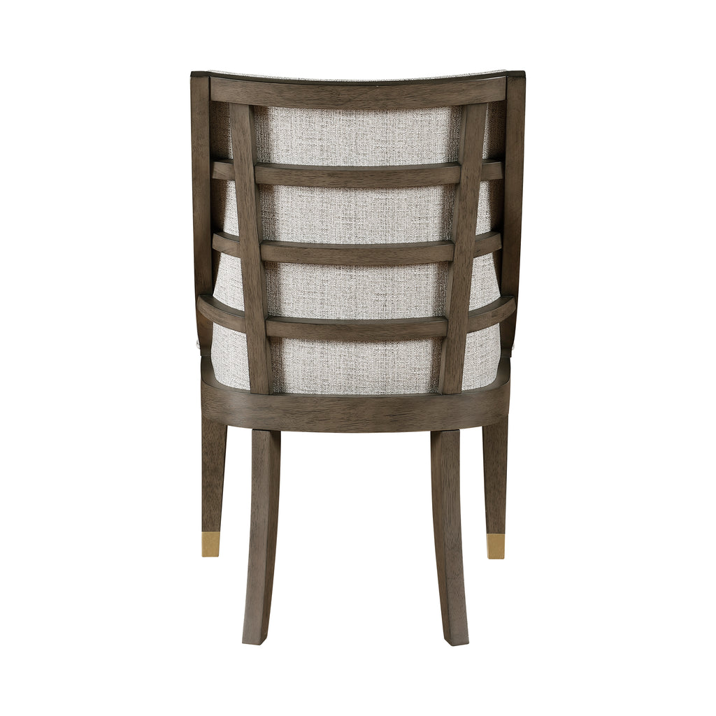 Curating a space that reflects your love for modern lines and desire for a sophisticated aesthetic becomes reality with the addition of the Griffin Collection. A brown finish highlights the arm chair's oak veneer pattern, its rich hue complemented by the gold finish metal banding that graces the chair's legs. The wood framed side chair features beige linen-like fabric upholstery covering the seat and back, providing perfect contrasting complement to the brown finish of the collection.