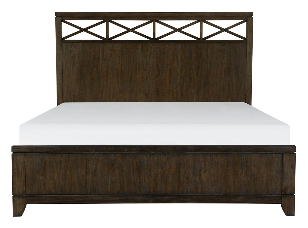 The contemporary styling of the Griggs Collection will be the perfect addition to your bedroom. The prominent ash veneer features a dark brown finish lending to the modern appearance. X-framing tops the headboard and understated lines of the panel bed. Fixed drawer pulls center each case piece further lending to the soft modern look. None