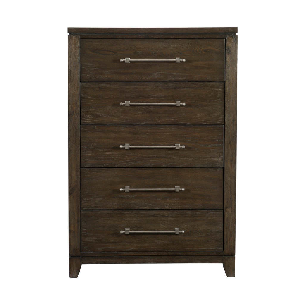The contemporary styling of the Griggs Collection will be the perfect addition to your bedroom. The chest’s prominent ash veneer features a dark brown finish lending to the modern appearance. Elongated fixed drawer pulls center each drawer front further lending to the soft modern look.