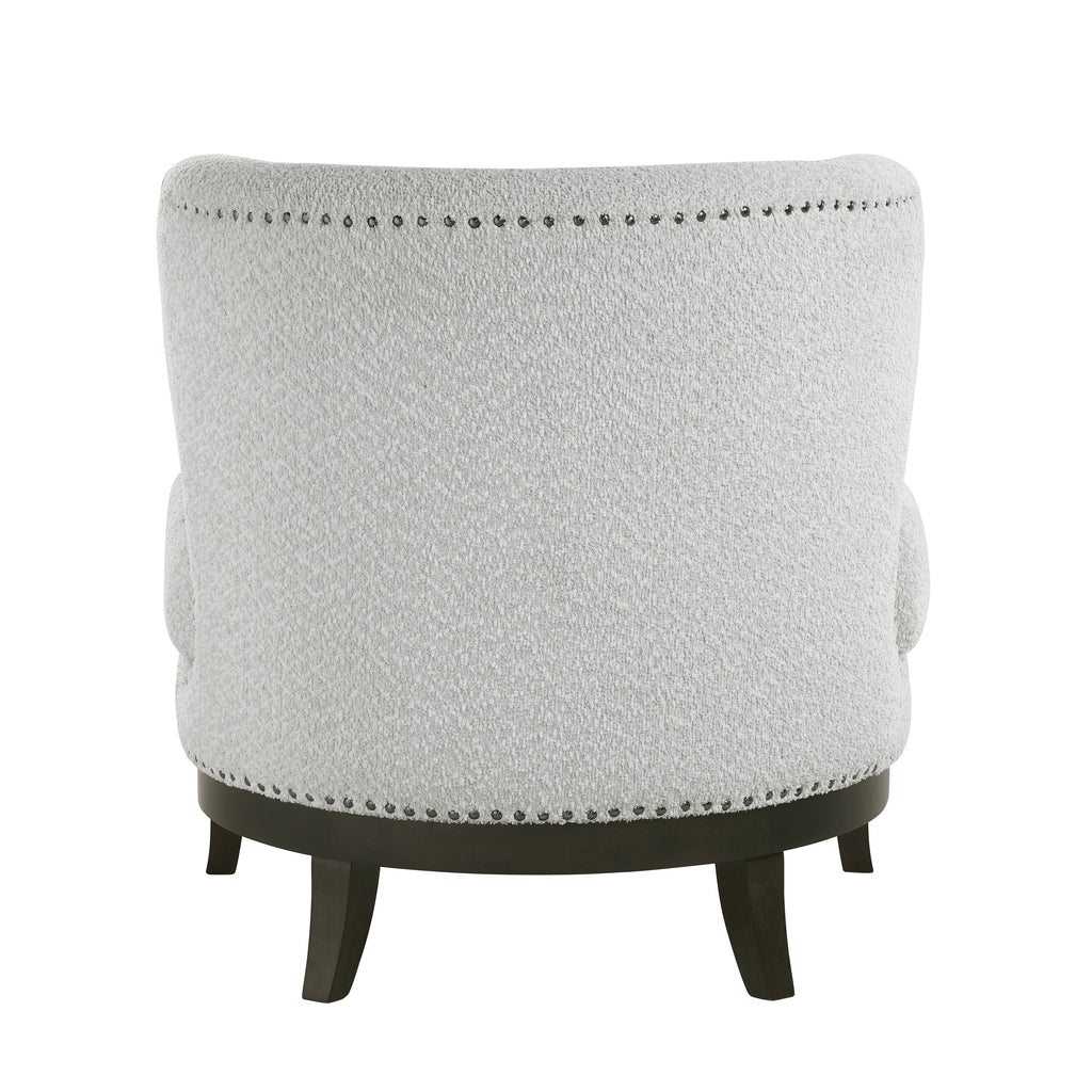 This elegantly designed accent chair, featuring a unique barrel back and sophisticated boucle fabric, is the perfect addition to any living space, bedroom, or office, offering both luxurious comfort and a touch of modern style. Crafted with a durable plywood frame, supportive foam padding over pocket coils, and solid wood legs, this chair ensures lasting quality and unparalleled relaxation, making it an ideal choice for reading, lounging, or adding an exquisite focal point to your decor.
