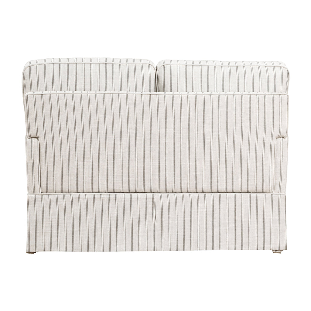 A refreshing addition to your living room comes in the form of the Hampstead Collection. An elegant pairing of classic designs creates a unique seating arrangement whether arranged together or as individual accents to your home’s décor. Covering the love seat is gray and white stripe textured fabric upholstery, its pattern and hue a neutral complement to your space. Tailored lines provide classic detail to love seat, while the slipcover styling lends a casual vibe. 55.5 x 37 x 39H