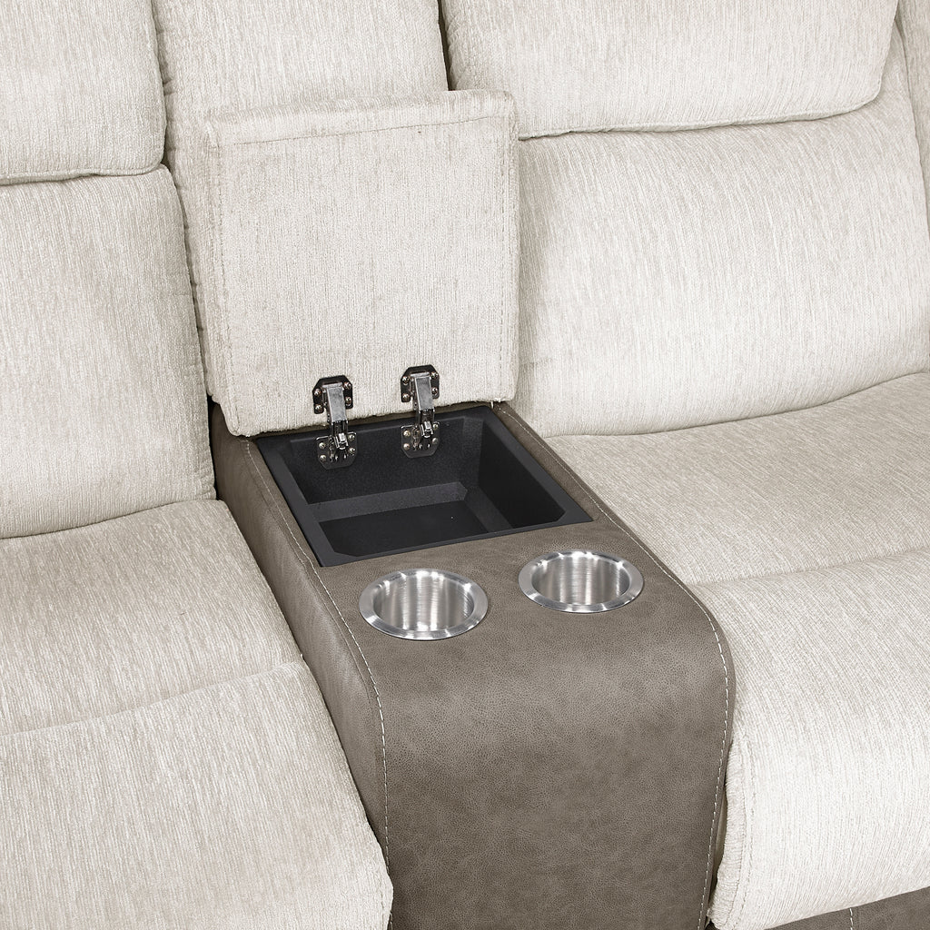 Experience the perfect blend of comfort, convenience, and style with our double reclining loveseat, featuring a practical center console. Upholstered in a sophisticated combination of soft chenille on the seating surfaces and durable polished microfiber on the sides, this loveseat offers a unique and inviting aesthetic. Each seat reclines independently with an easy-to-use tab pull, allowing you and a loved one to find your ideal lounging position effortlessly. The integrated center console provides convenient storage and includes two cup holders, keeping your essentials within easy reach. Built with a sturdy solid wood and plywood frame and metal-reinforced seats, this reclining loveseat ensures lasting durability and supports up to 300lbs per seat, making it the perfect addition to your living space for shared relaxation and functionality.