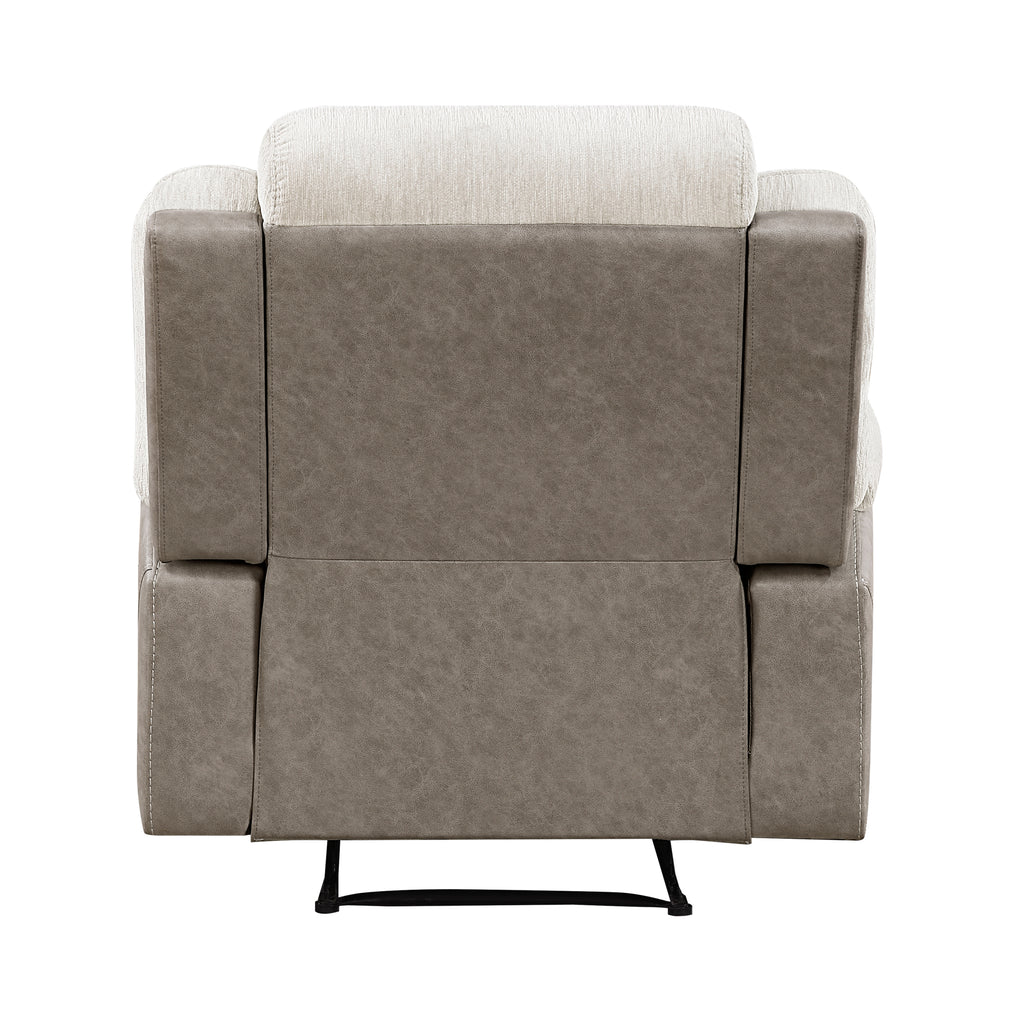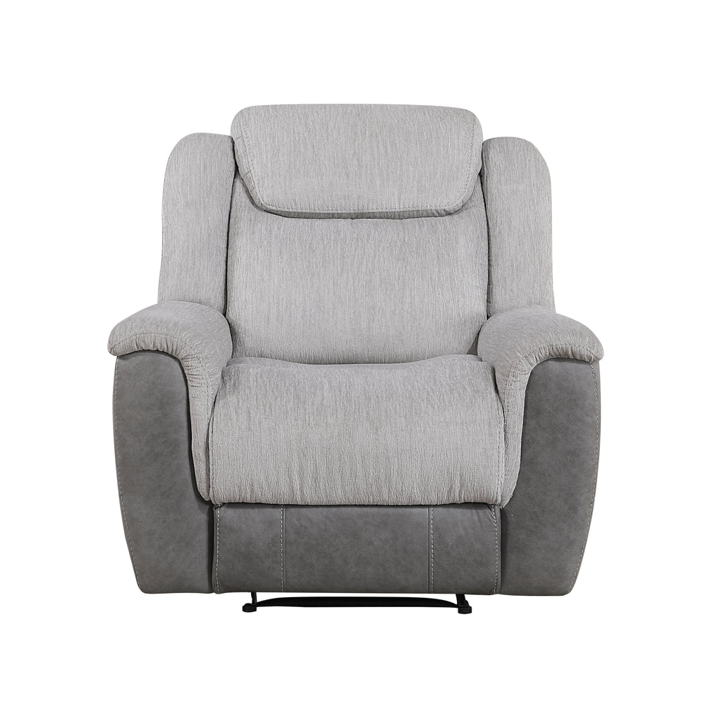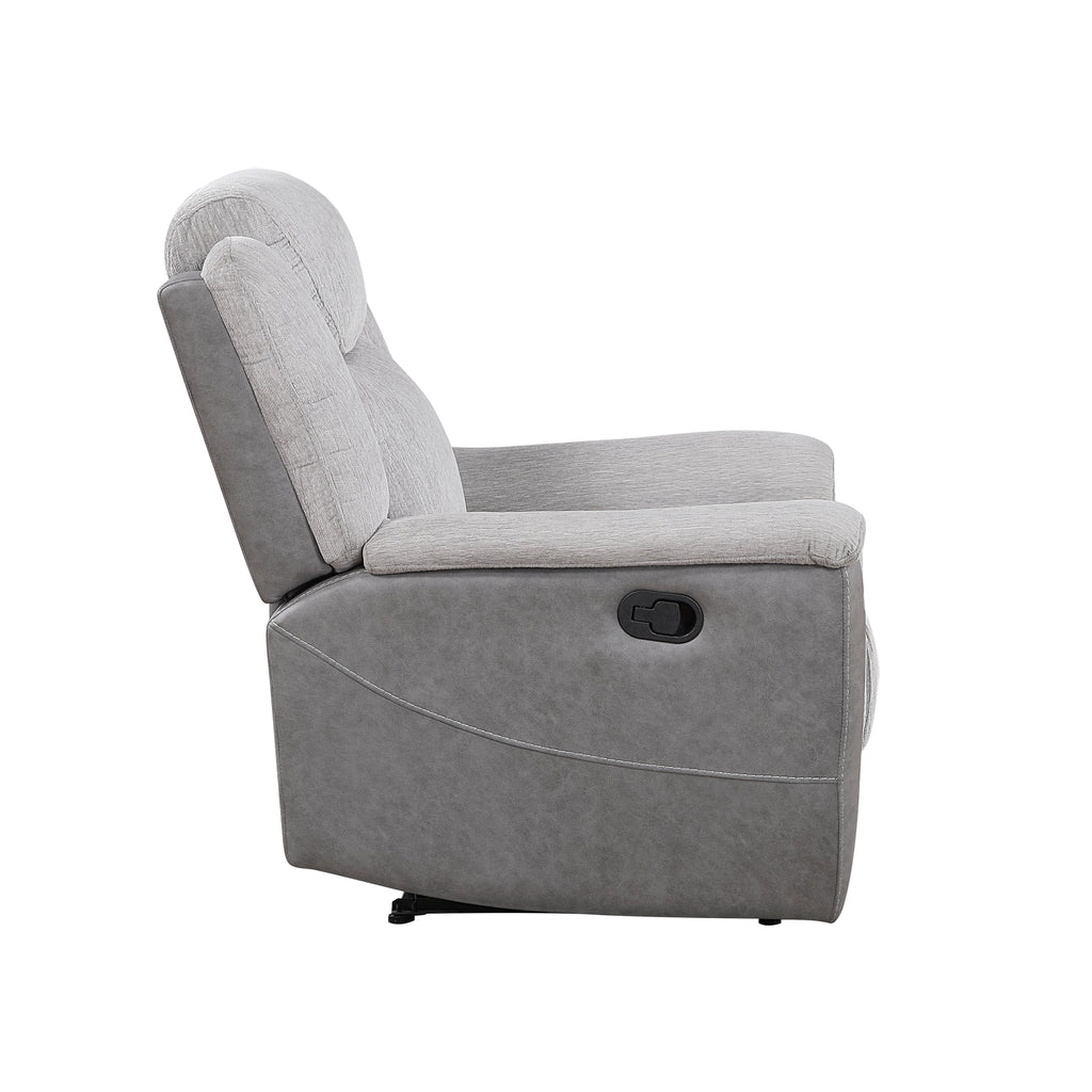Indulge in ultimate relaxation with our stylish and comfortable recliner, featuring a unique dual-fabric upholstery for a touch of modern elegance. Crafted with plush chenille on the seating surfaces and a smooth, polished microfiber on the sides, this recliner offers both luxurious comfort and lasting durability. Sink into the supportive foam padding over individual pocket coils, providing exceptional resilience and personalized comfort for hours of lounging. The easy-to-use tab pull mechanism allows for effortless reclining, inviting you to lean back and unwind. Built with a sturdy solid wood and plywood frame and a metal-reinforced seat, this recliner ensures stability and supports up to 300lbs, making it a perfect and lasting addition to your living space.