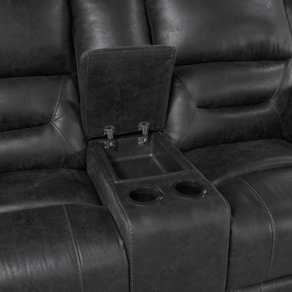 The Hazen Collection’s versatile style and functional design will be an inviting addition to your home’s living room. Dual end recliners are featured on love seat, with its center console providing secure storage of beverages via the two cupholders and a lift-top storage compartment. The reclining mechanisms of the love seat are engaged with a pull of their side mounted tabs, taking you from seated to prone in an easy motion. Black polished microfiber upholstery covers the plush pillow-top arms and contoured seating, creating a perfect combination ready for relaxation.