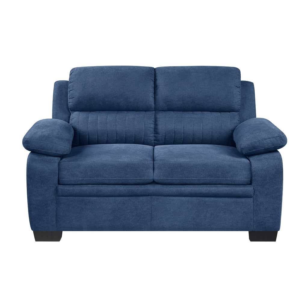 A modern profile serves to lend visual contrast and support to the plush seating and pillow-top arms of the Holleman Collection. The blue textured fabric cover acts as a neutral palette for your decorative preferences. Channel tufting accents the lower seatbacks of the love seat providing subtle accent to the collection. 58 x 35.5 x 35H