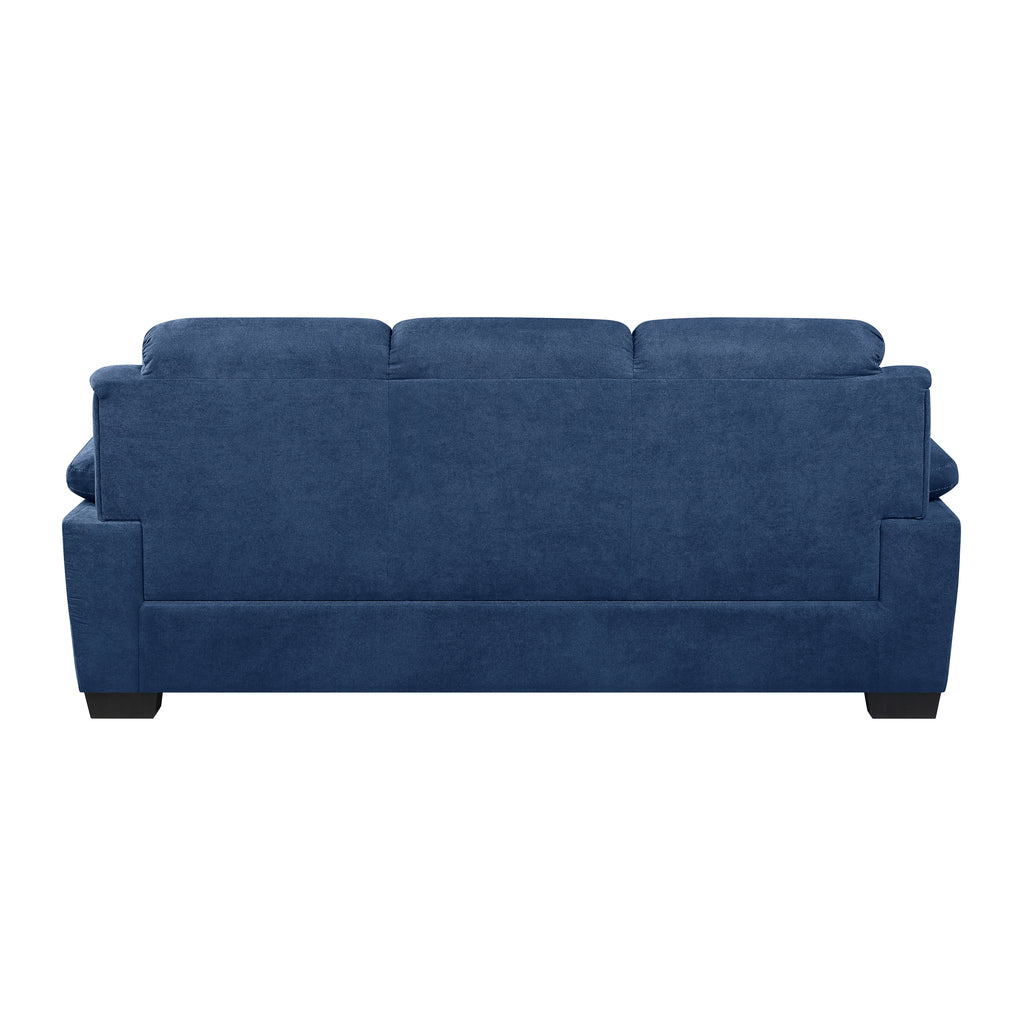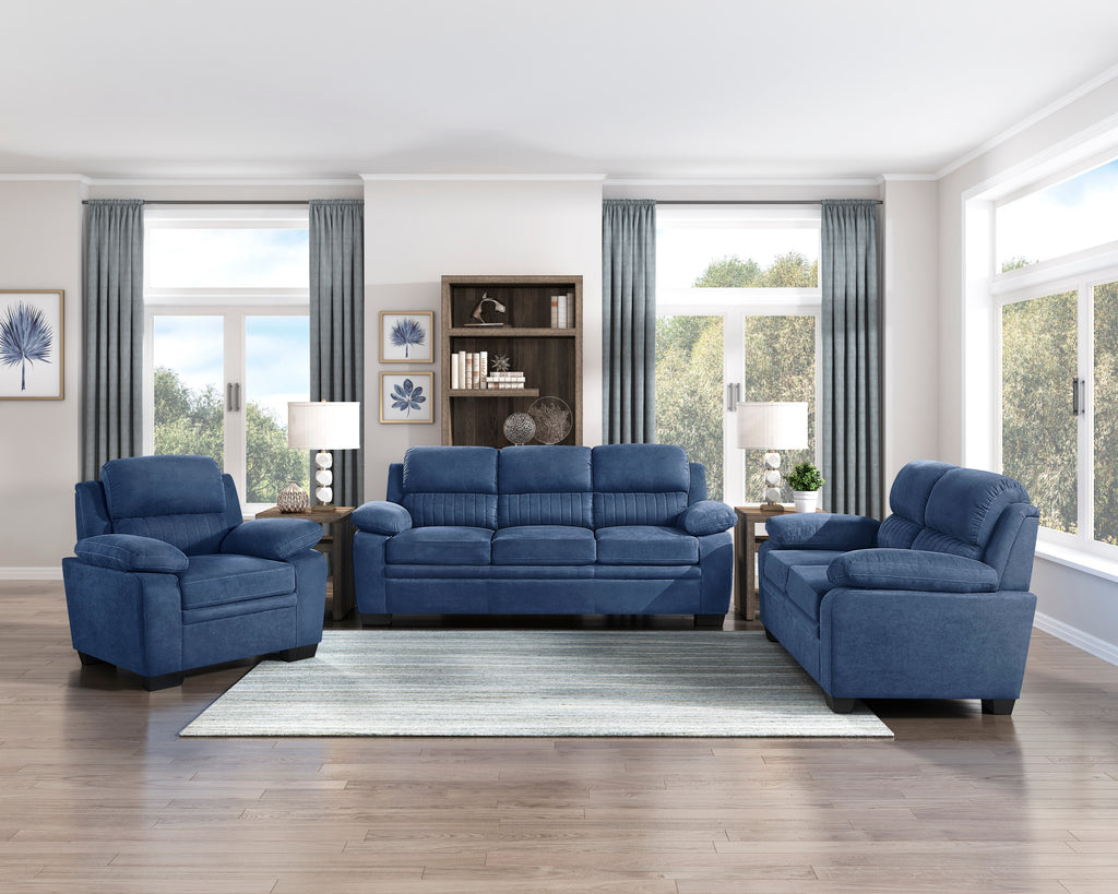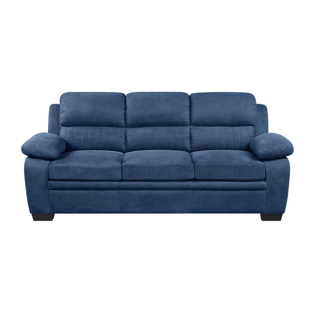 A modern profile serves to lend visual contrast and support to the plush seating and pillow-top arms of the Holleman Collection. The blue textured fabric cover acts as a neutral palette for your decorative preferences. Channel tufting accents the lower seatbacks of the sofa providing subtle accent to the collection.