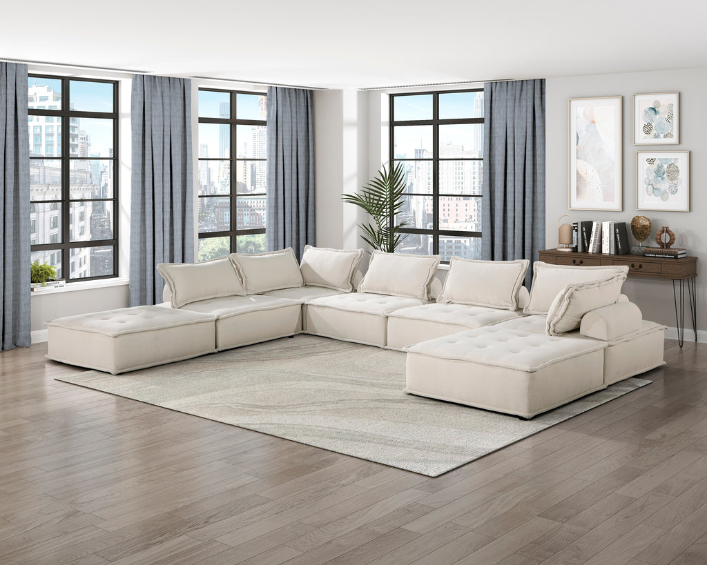 With a look that presents the hallmarks of modern design and allows for functional placement within your living room, the Inman Collection is a perfect seating option for your family’s needs. The square ottoman-style modular accent chair allows for custom configuration perfect for your available space or occasion needs, whether you need one or multiple units. Beige boucle fabric upholstery covers the collection. The low-profile stance of the chair lends to the modern profile while the zipper-paired pillow and bolster provide supporting accent.