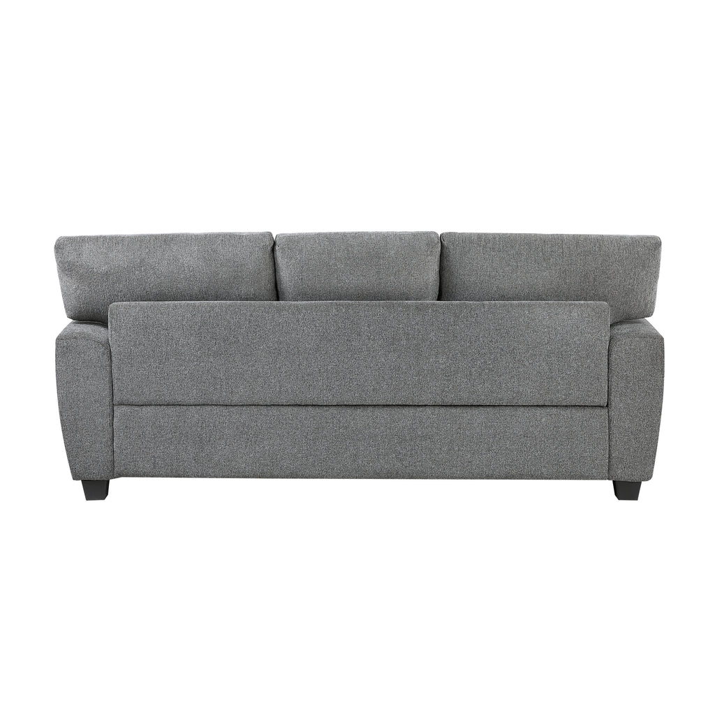 Enhance your living space with this versatile and stylish gray Sofa. Featuring reversible back and seat cushions, this 3-seater couch offers extended comfort and longevity, allowing you to easily refresh its appearance. Two decorative pillows add a touch of pattern and comfort. The textured dark gray fabric upholstery complements a variety of décor styles, while the nailhead trim detailing adds a touch of sophistication. The sturdy block feet provide a stable foundation, making this sofa a perfect addition to family rooms, living rooms, or entertainment areas. Enjoy the perfect blend of comfort, style, and practicality with this contemporary couch.