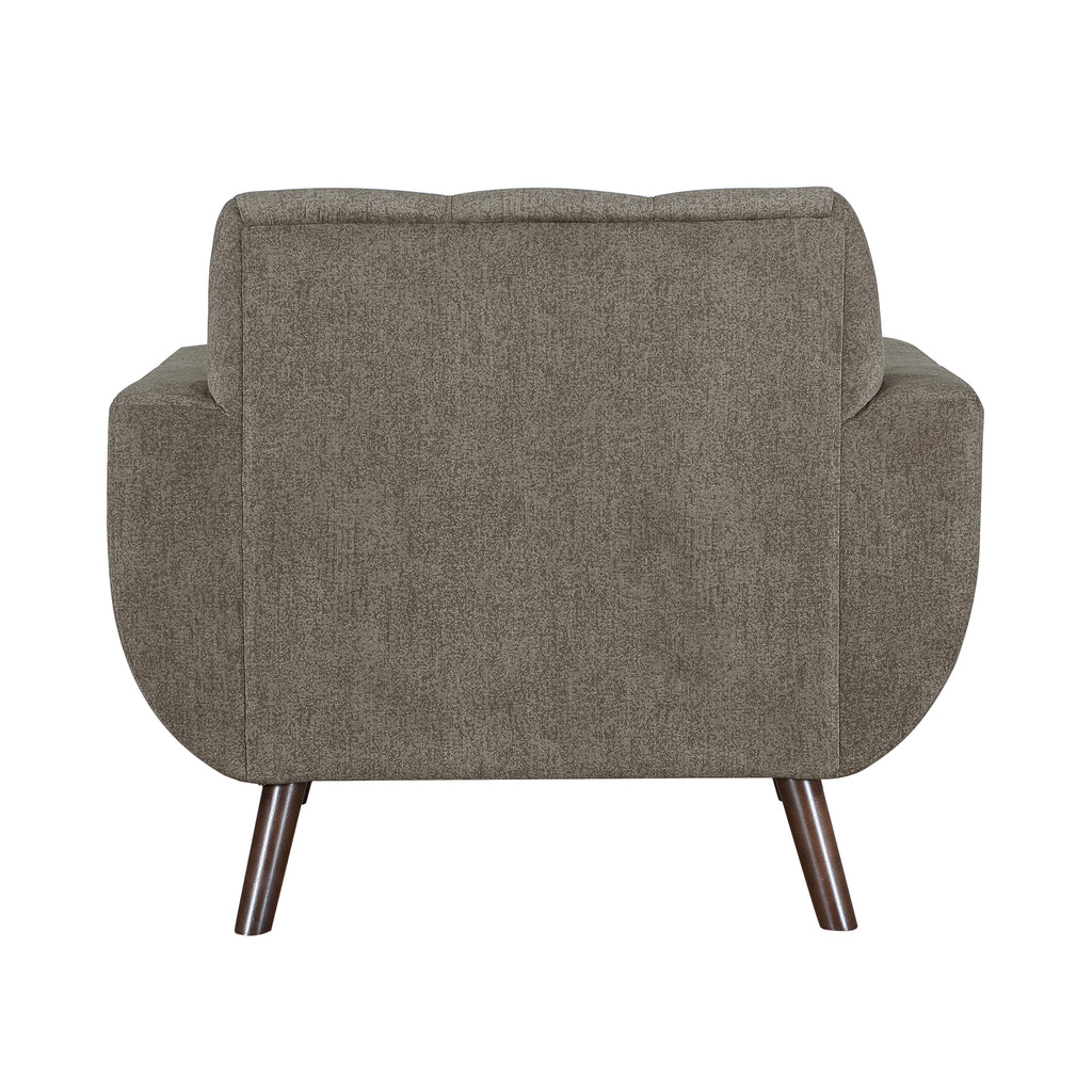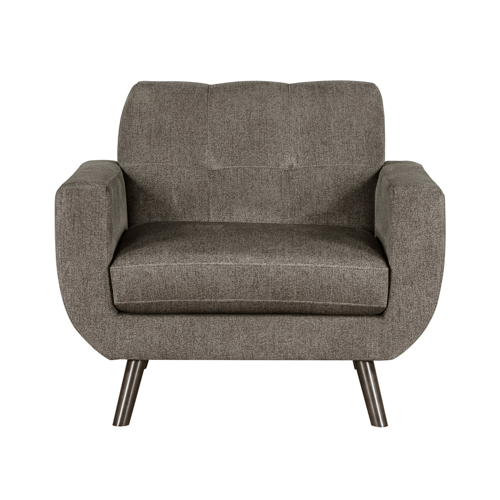 Timeless design never goes out of style, and the classic look of the Janne Collection follows the mid-century aesthetic of clean lines and modern sensibility. Brown, cafe-hued, textured microfiber upholstered fabric covers the retro-inspired frame of the chair with walnut-finished wood legs providing complementing accent to the group. Contour stitching lends scalloped detail to the seatback’s profile, and front, while the prominent framing of the collection’s arms solidifies the Mid-Century Modern look. The collection also features reversible seat cushions. 41.5 x 35.5 x 35.5H