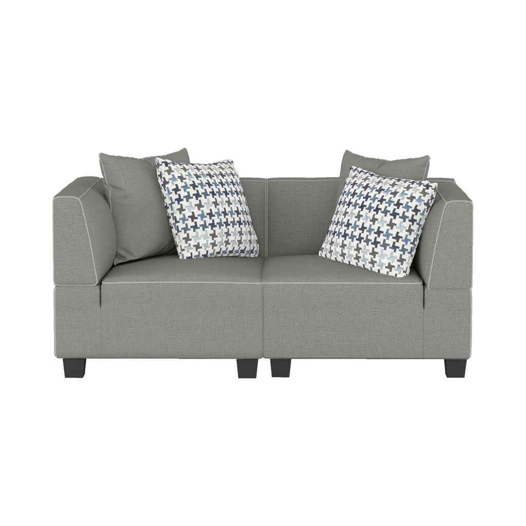 The modular design of the Jayne Collection provides a versatile seating experience configurable to your modern living room’s available space. Two corner units can be paired to create a plush love seat. The gray textured fabric of the collection features profile-defining contrast welt while the chenille multi-toned geometric print that covers the toss pillow provides complementing contrast. 72.5 x 36.5 x 34.5H
