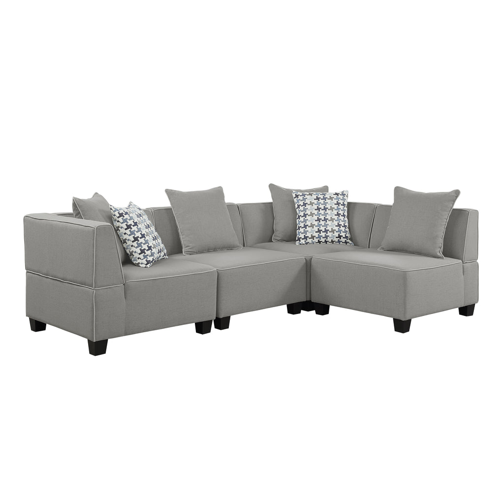 The modular design of the Jayne Collection provides a versatile seating experience configurable to your modern living room’s available space. Pair two armless chairs with two coordinating corner units to create plush sectional seating. The gray textured fabric of seating group features profile-defining contrast welt and chenille multi-toned geometric print toss pillows that provide complementing accent to the neutral tone of the collection’s cover. 106.5 x 70.5 x 34.5H
