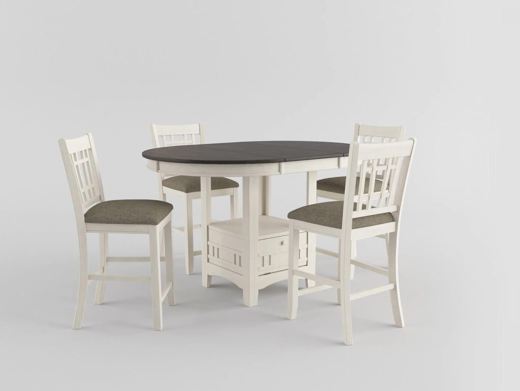 Utilizing the traditional elements of mission styling, the Junipero Collection adds the feel of the Arts and Crafts design movement to your casual dining room. Framing, unique to the classic style, comprises the profile of the wood-framed counter height chair back. The white finish over oak veneer serves to highlight the wood’s grain.