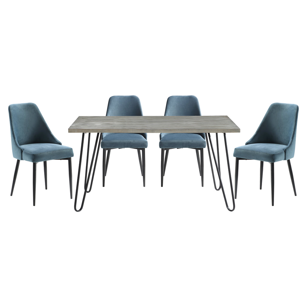 From its streamlined profile to the vibrant hues that contrast the table’s neutral finish, the modern design of the Keene Collection will blend perfectly with your dining room’s sleek aesthetic. A gray finish over oak veneer subtly highlights the distinct grain of the wood, while lending neutral contrast to the three available -blue, orange, and gray - velvet upholstered coverings of the accompanying side chairs. Black-finished hairpin legs support the table’s fixed top. None
