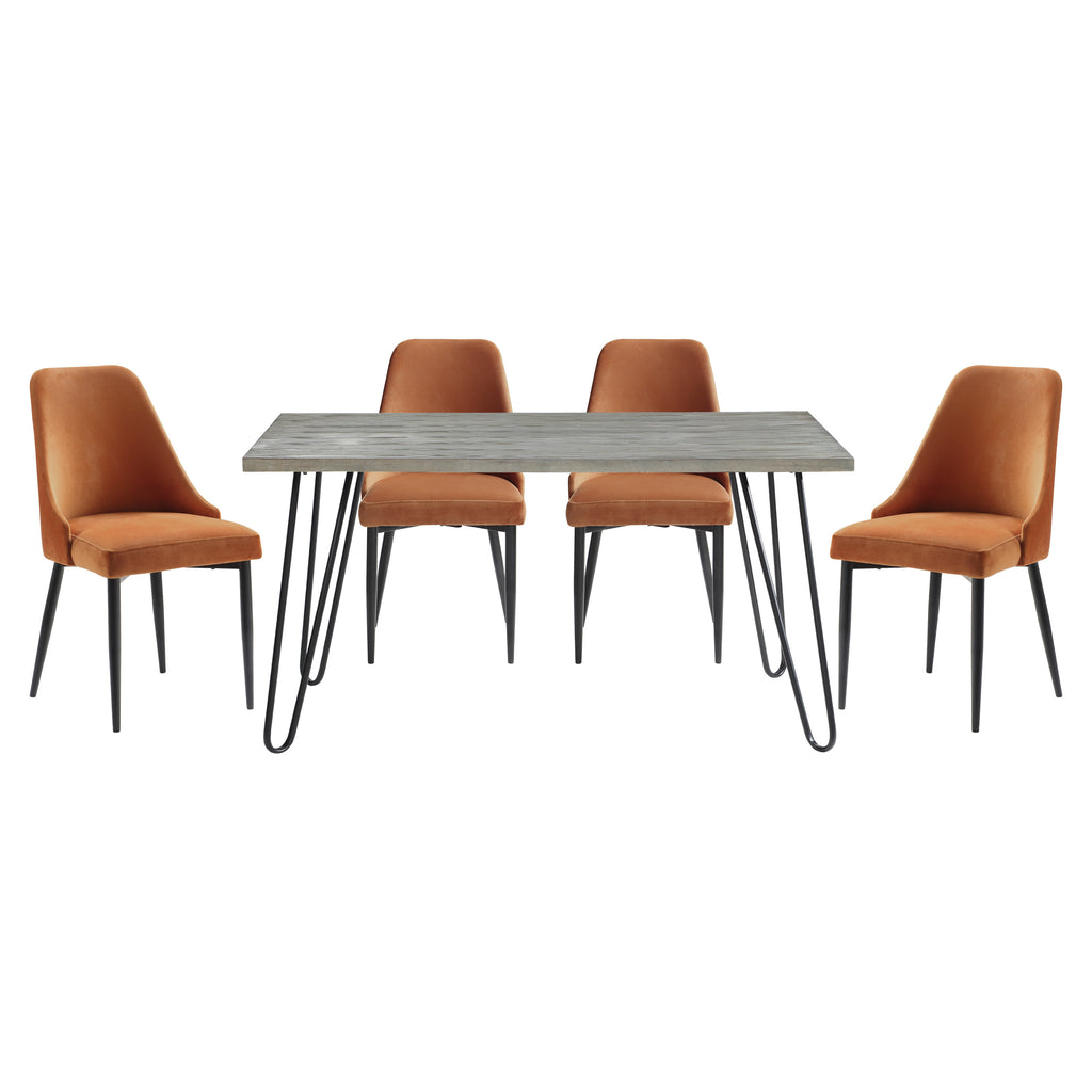 From its streamlined profile to the vibrant hues that contrast the table’s neutral finish, the modern design of the Keene Collection will blend perfectly with your dining room’s sleek aesthetic. A gray finish over oak veneer subtly highlights the distinct grain of the wood, while lending neutral contrast to the three available -blue, orange, and gray - velvet upholstered coverings of the accompanying side chairs. Black-finished hairpin legs support the table’s fixed top. None