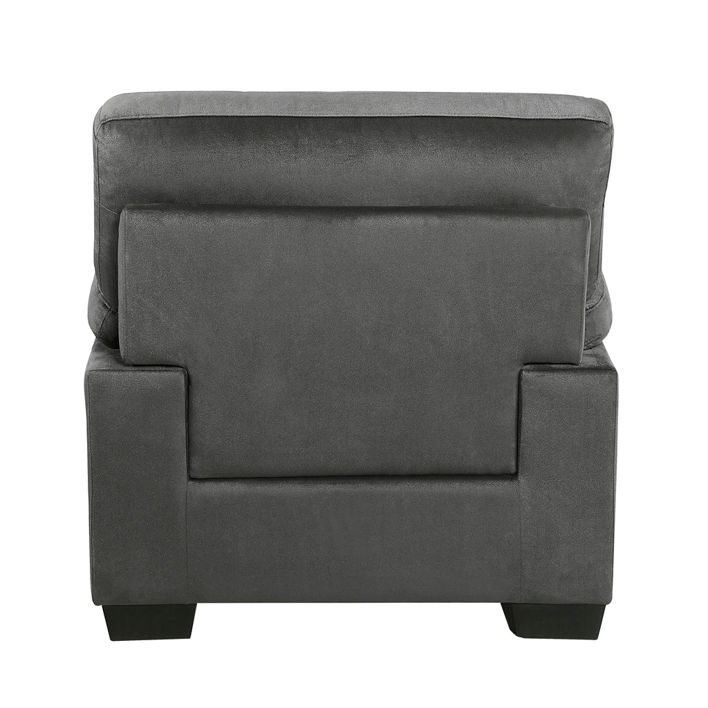 The sleek profile of the Keighly Collection will be the perfect complement to your modern living room. The chair features a dark gray fabric cover for the ultimate decorative versatility, while pillow-top arms and plush seating create a platform that is perfect for your comfortable seated relaxation. 41 x 34.5 x 35H