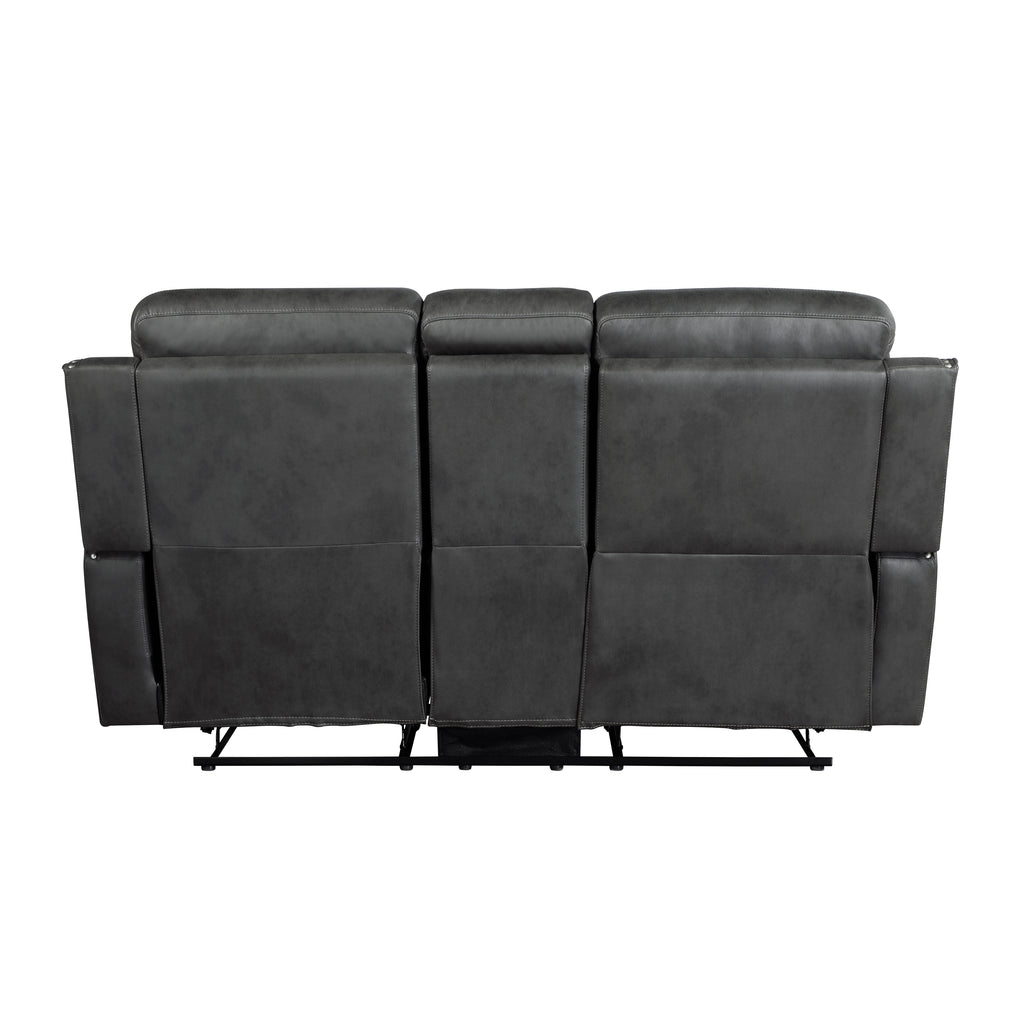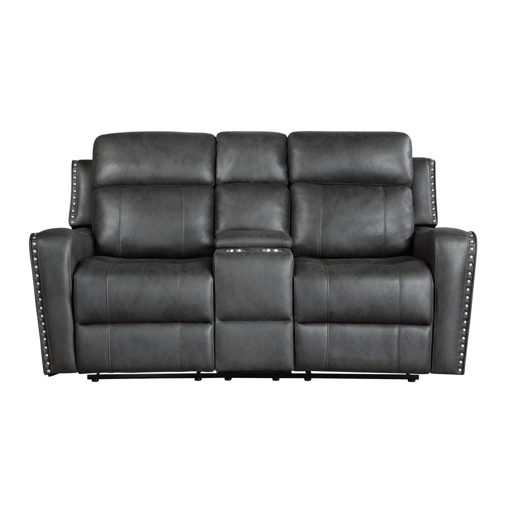 Enhance your shared relaxation space with the double reclining loveseat, featuring a convenient center storage console and dual cup holders. Upholstered in a sophisticated, breathable polished microfiber accented with elegant nailhead trim, this loveseat offers both luxurious comfort and practical functionality. Each seat reclines independently with a smooth pull-handle motion, allowing you and your companion to find your perfect lounging positions. The dacron-wrapped high-density foam seat cushions provide exceptional support for extended comfort, while the robust solid wood and plywood frame with metal-reinforced seating ensures lasting durability, supporting up to 300lbs per seat. With its attached back and seat cushions maintaining a clean aesthetic and the added benefit of a central storage console for remotes and beverages, the loveseat is the ultimate addition to any living room or home theater seeking style and convenience.