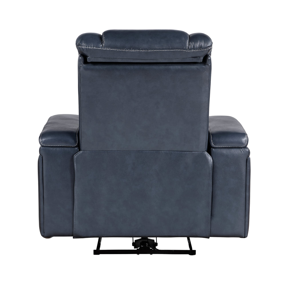 An amalgamation of modern lines, comfort, and functional comfort, the Keziah Collection is a bold choice for your living room. The chair has a power motion mechanism that allows for the extension of the footrest and headrest that is conveniently accessed with a touch of the side mounted one-touch control, while hidden armrests provide a convenient spot to place your remote control or electronic devices. Further enhancing your comfort is the 100 percent top grain leather cover - where the body touches, with faux leather-match everywhere else – its blue hue adding bold accent to your living room’s décor. 38 x 39 x 42H