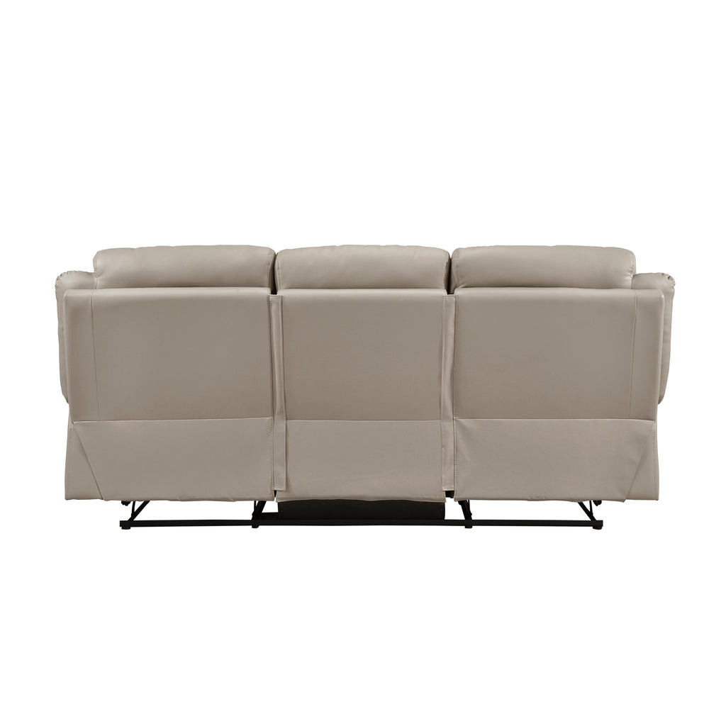 Designed with stylistic versatility and comfort in mind, the Laconia Collection’s addition to your home’s casual living room provides a comfortable gathering spot for your family and friends. The reclining ends of the sofa are engaged with a pull of the side mounted tab. The transitional frame of the sofa is covered in 100 percent top grain leather where the body touches, with faux leather covering the remaining areas, its latte hue complementing your home’s décor.