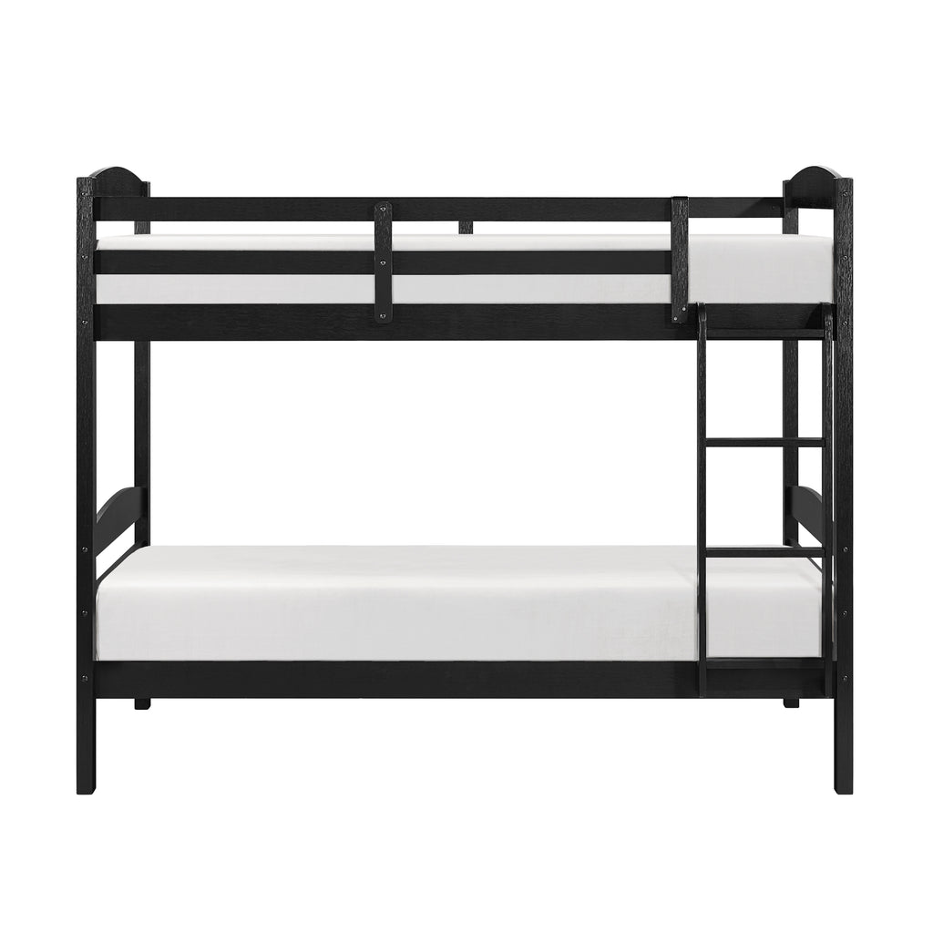 Maximize space and add functional style to any shared bedroom or guest room with this sturdy twin-over-twin bunk bed. Crafted from a durable blend of wood and engineered wood, and finished in a sleek wire-brushed black, this bunk bed offers a contemporary look and long-lasting stability. The top bunk is equipped with secure guard rails and a sturdy ladder for safe and easy access. Designed for convenience, a foundation or box spring is not required, as the included slats provide ample mattress support. This compact and efficient sleep solution is perfect for siblings or sleepovers, ensuring a safe and comfortable night's rest for everyone (note: top bunk not for children under 6; max 6-inch mattress height for top bunk).