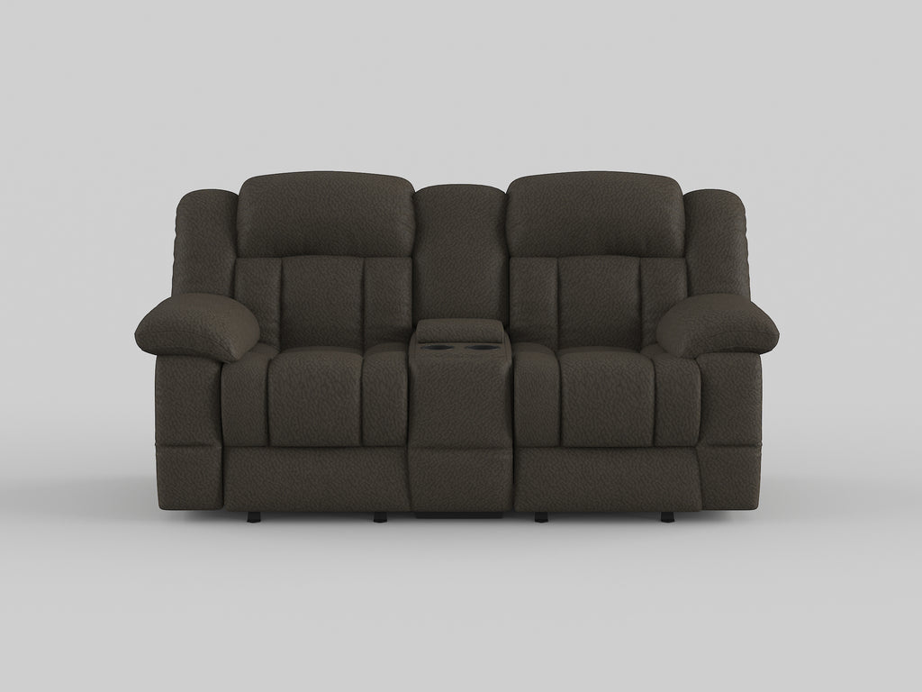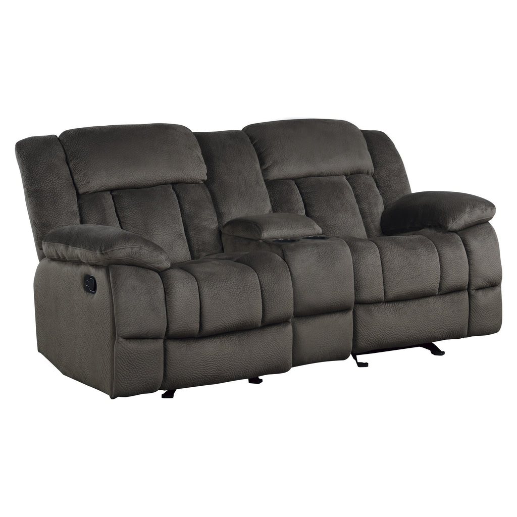 Generous seating combined with functional touches makes the Laurelton love seat the perfect addition to your living room. The double glider reclining love seat’s center console features dual cup holders and hidden storage. Chocolate textured plush microfiber fabric is available as cover options for this amply appointed love seat.