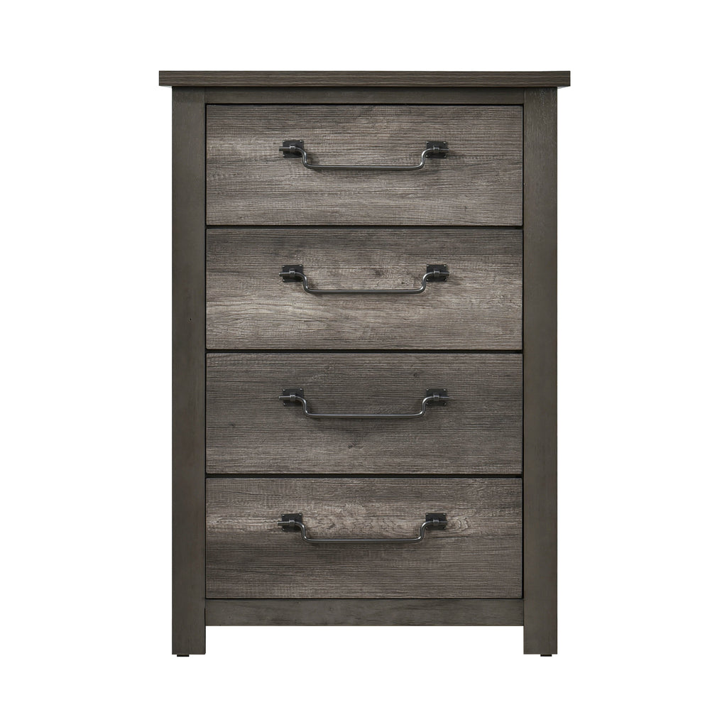 Subtle design characteristics lend hints of rustic, industrial and transitional aesthetics to the classic look of the Lenoir Collection. The gray finish of the melamine laminate’s faux wood lends durability to the rustic finish of the collection. Gunmetal-hued metal drop hardware fronts the drawers of the chest providing an industrial-inspired accent to the look of the collection.