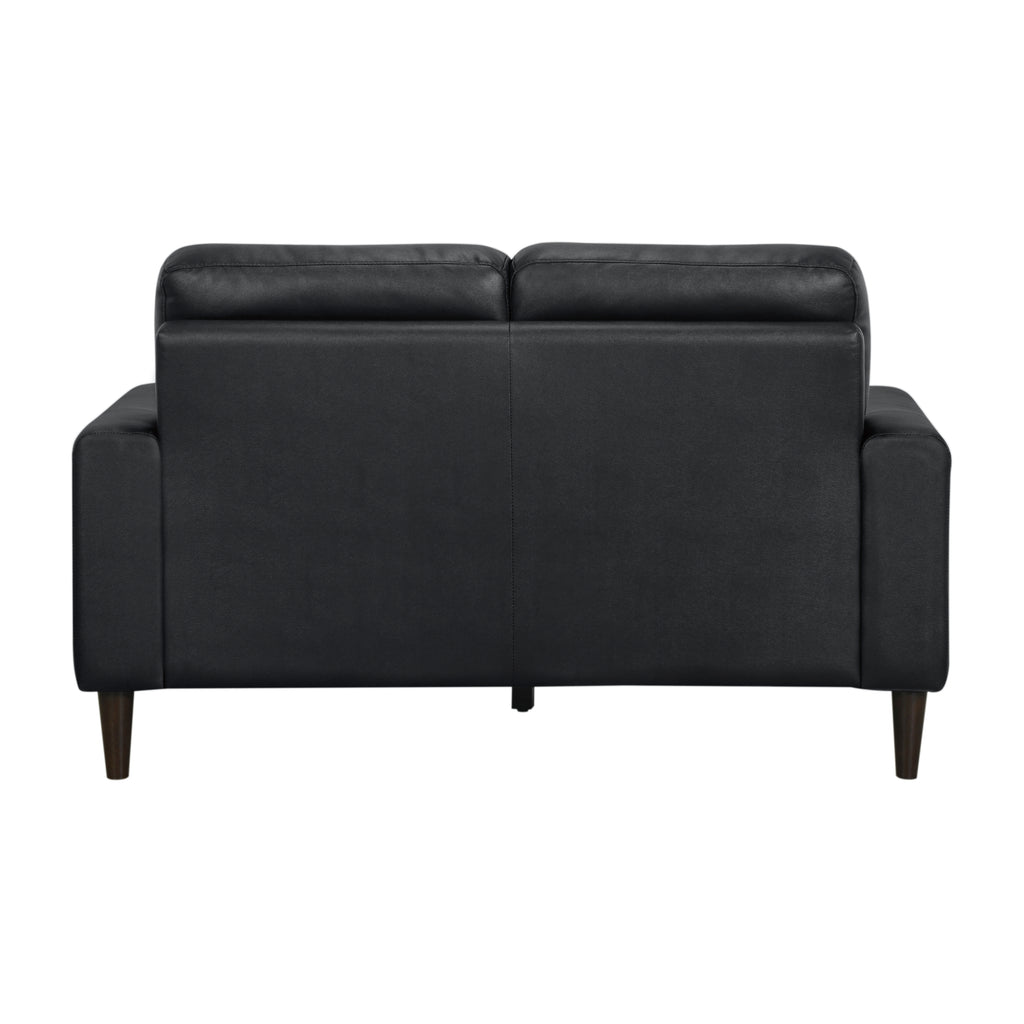 Modern comfort is paired with retro lines to create the design of the Lewes Collection. Covering the love seat is Latte-hued 100% top grain leather where the body touches, while all other areas feature faux leather. Track arms and contoured seating lend to the versatile modern look. Supporting the love seat are solid wood legs with a brown finish.