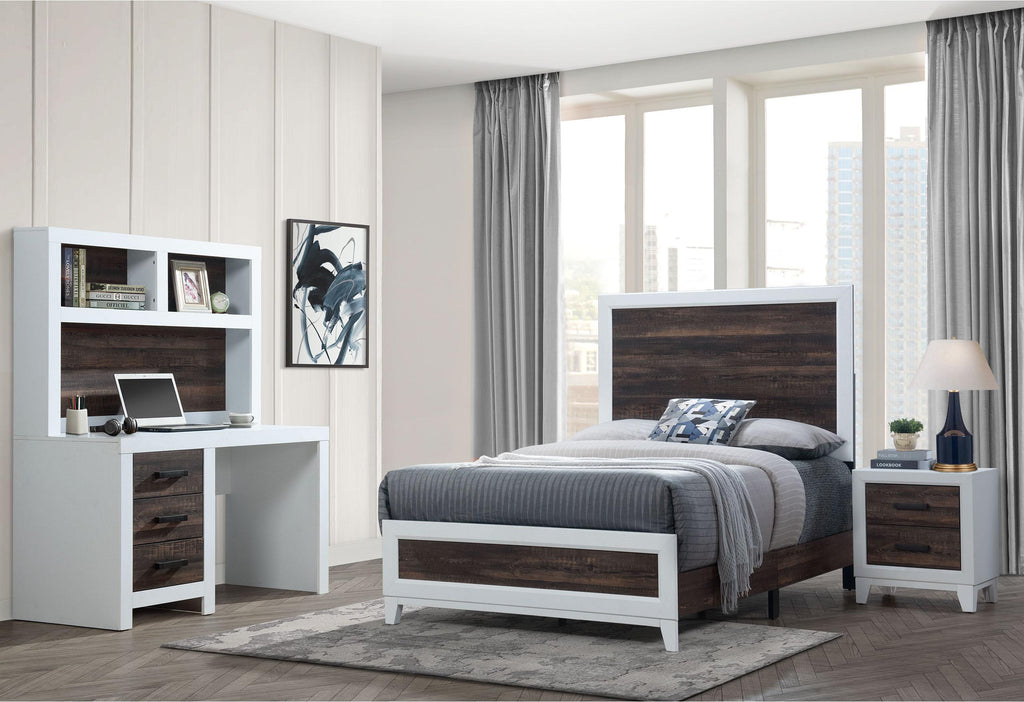 LISBON OAK/WHITE TWIN BED, DRESSER, MIRROR AND NIGHTSTAND