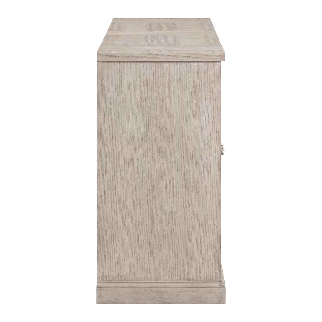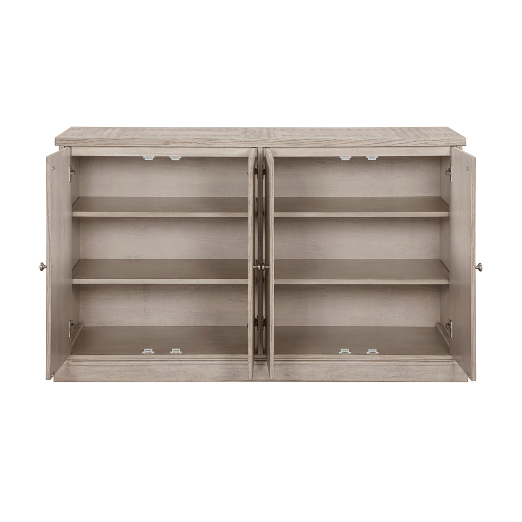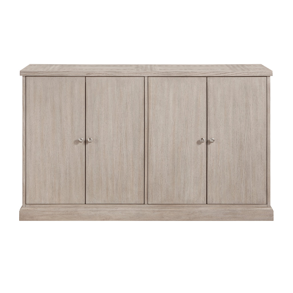 Organize your dining or living space with this stylish and functional server cabinet. Crafted from durable oak veneer, wood, and engineered wood, and featuring a contemporary light gray finish, this server is built for lasting beauty. It offers ample storage with two side cabinets, each containing two adjustable shelves, perfect for dinnerware, linens, or media. The polished chrome-tone knobs add a touch of modern elegance, making this versatile piece a perfect addition to any home. Best of all, no assembly is required, so you can enjoy it right away.