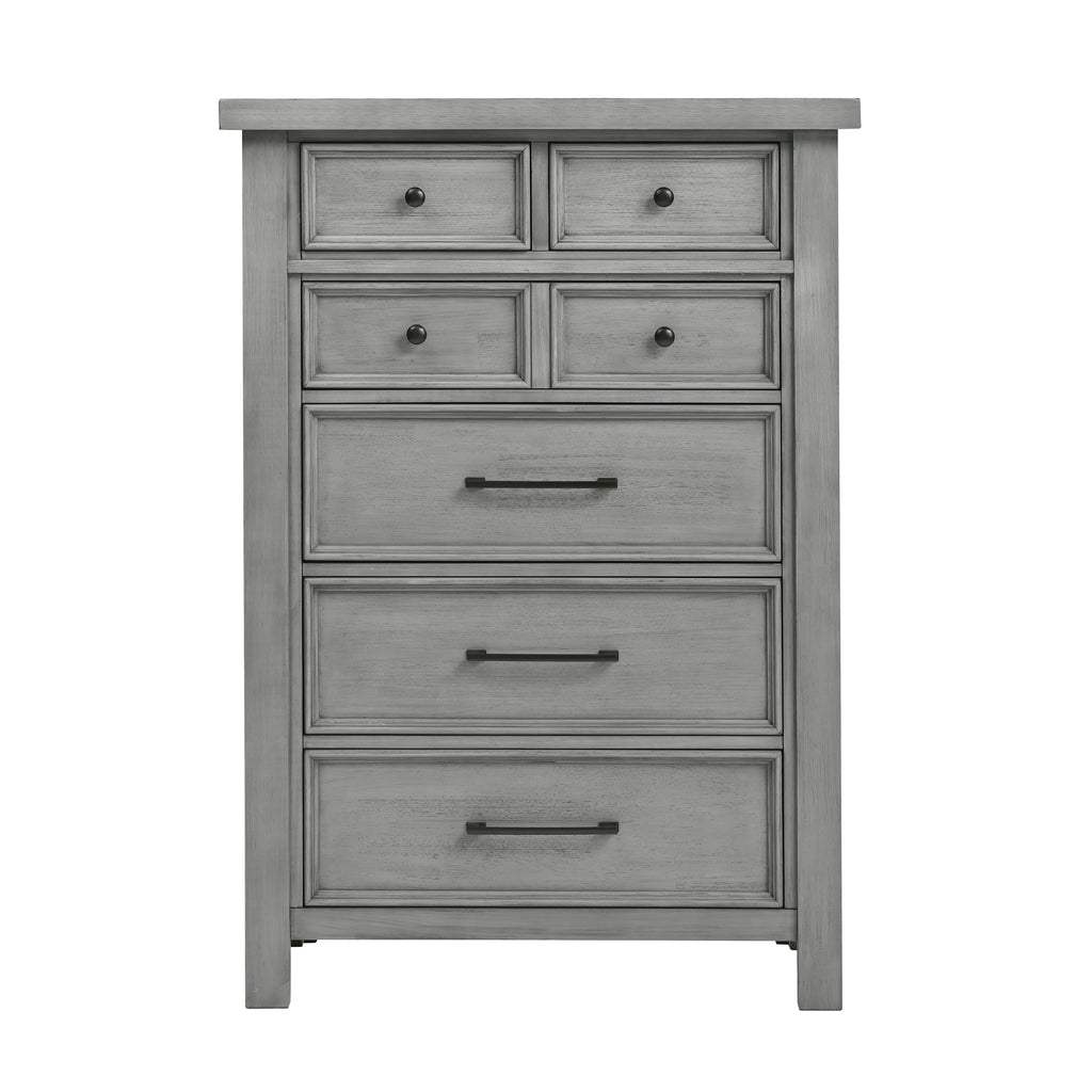 The transitional framing of the Logandale Collection allows for versatile placement within a number of classic bedroom decors, making a perfect choice for your home. A brown finish is utilized over mango veneer for subtle highlighting of its distinct grain. Dark finished metal knob and pull hardware front each drawer of the chest, creating a complementing accent to the collection.