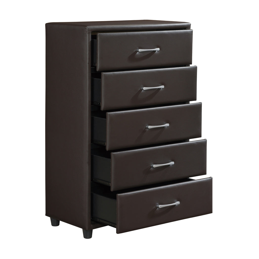 The contemporary design of the Lorenzi Collection is enhanced by the addition of the durable black faux leather covering that encases the chest of the collection. Silver tone hardware provides a distinct contrast to the faux leather covering. Scaled for urban living, this collection will prove to be a unique and stylish addition to your bedroom.