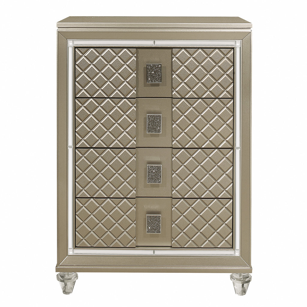 The glamour girl in your life will love the addition of the Loudon Collection to her bedroom. The champagne finish of the chest shimmers while additional sparkle comes in the form of the black encrusted drawer pulls, embossed diamond pattern accent, mirrored framing and acrylic feet.