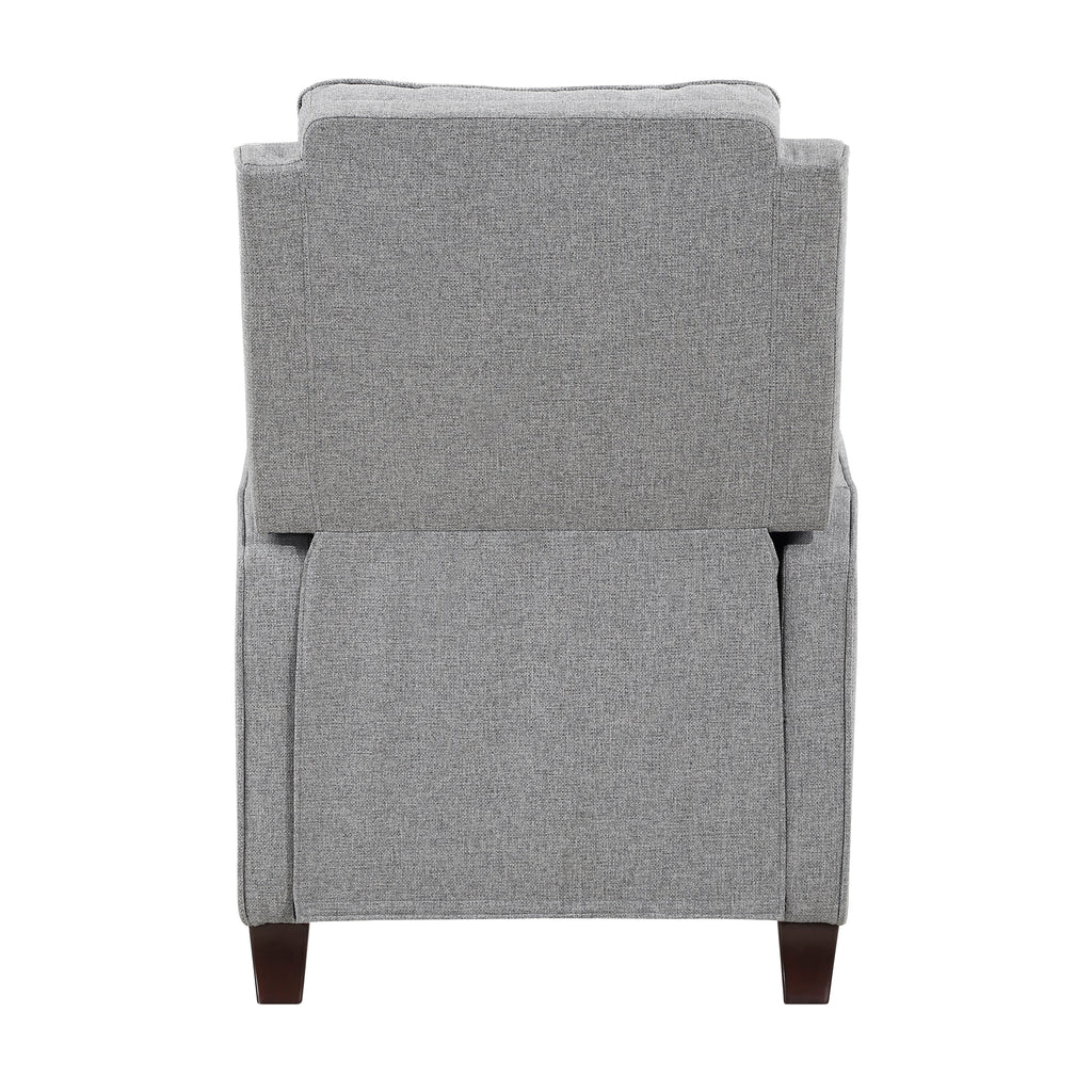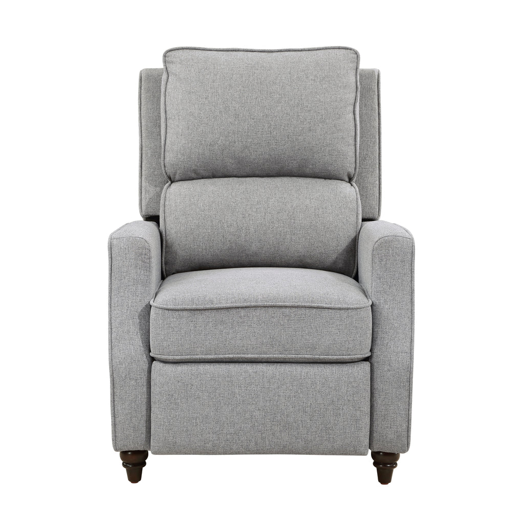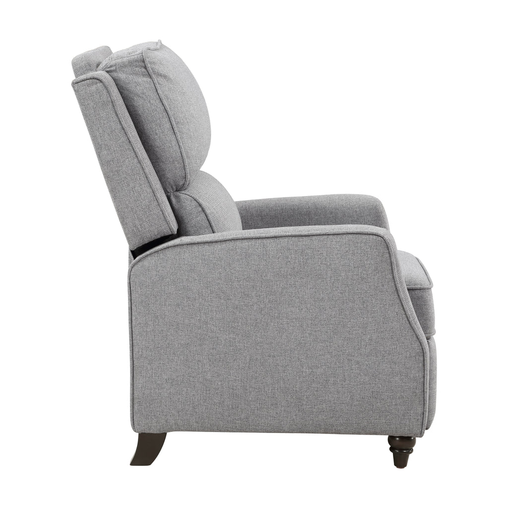 With a transitional style that complements myriad home aesthetics, the Loveland Collection provides comfort and function for your personal space. The recliner eases into the prone position with motion that is initiated by your push. Textured fabric upholstery covers the push back recliner, its beige hue providing neutral complement to your home’s existing décor. Support for the chair comes in the form of the dark brown finished turned wood legs.