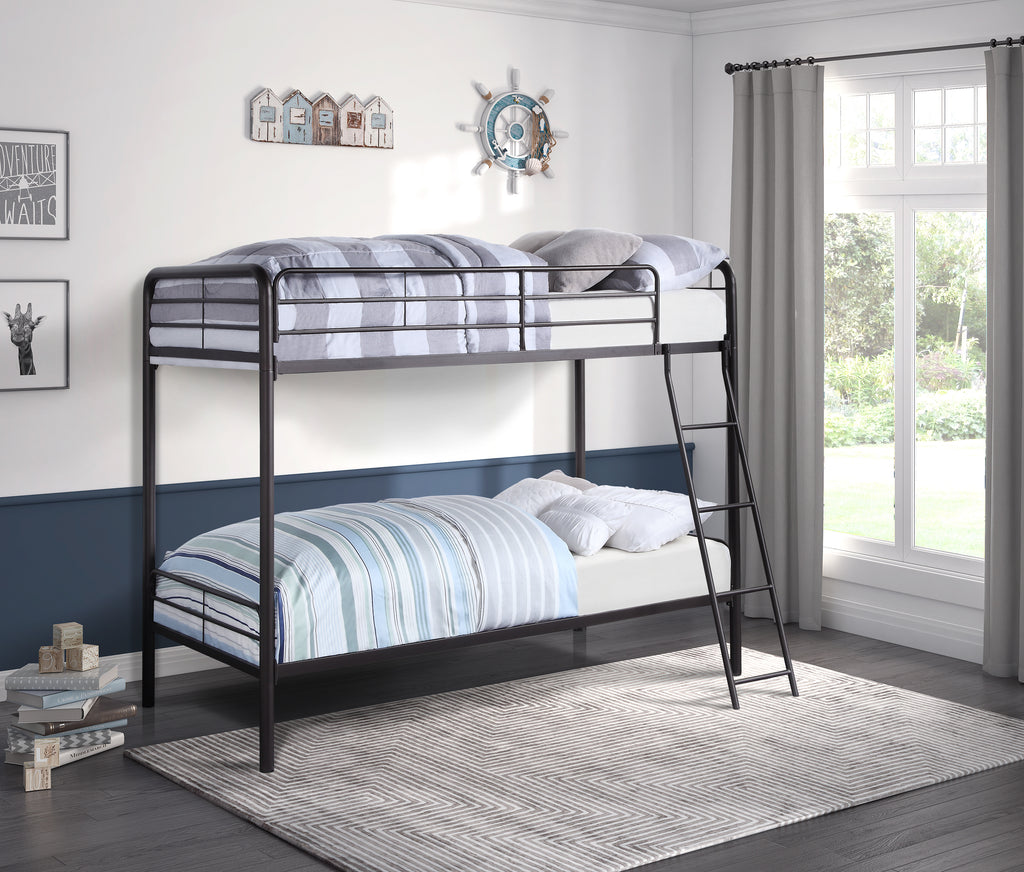 Bunkbeds allow for the maximization of sleep space within your child’s bedroom, creating efficient flow and plenty of room for play, and the Lunar Collection will be the perfect fit for your needs. The twin-over-twin bunkbed is designed to meet the needs of your available space. The tubular metal structure of the bunkbed’s frame is finished in dark bronze, creating a neutral complement to your chosen décor.