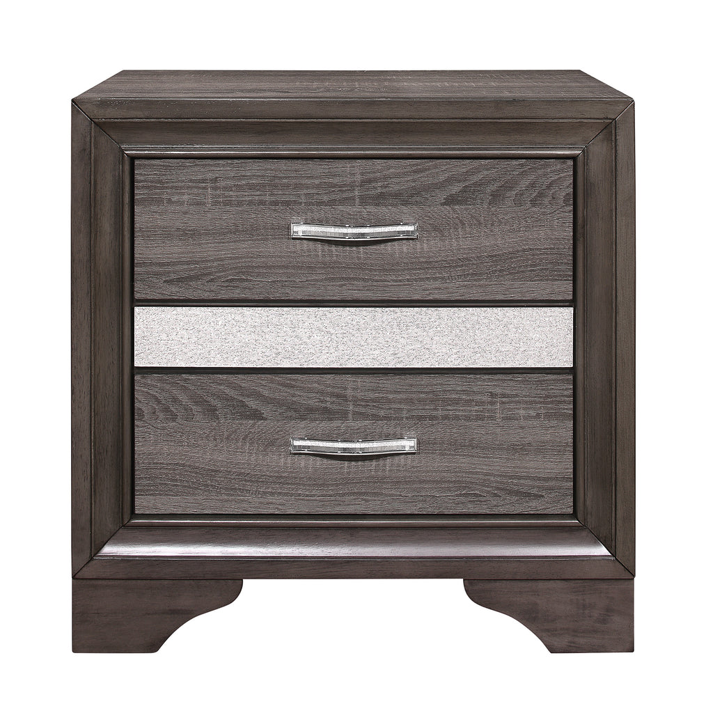 The unique styling of the Luster Collection presents a glamorous option for your bedroom. The nightstand’s embossed faux-wood veneer features a gray finish that allows for the acrylic silver glitter front of the hidden jewelry drawer to shine. The jewelry drawer features felt lining to protect your hidden items from wear and tear. Polished chrome bar drawer pulls front the drawers providing complementing contrast to the collection’s finish.