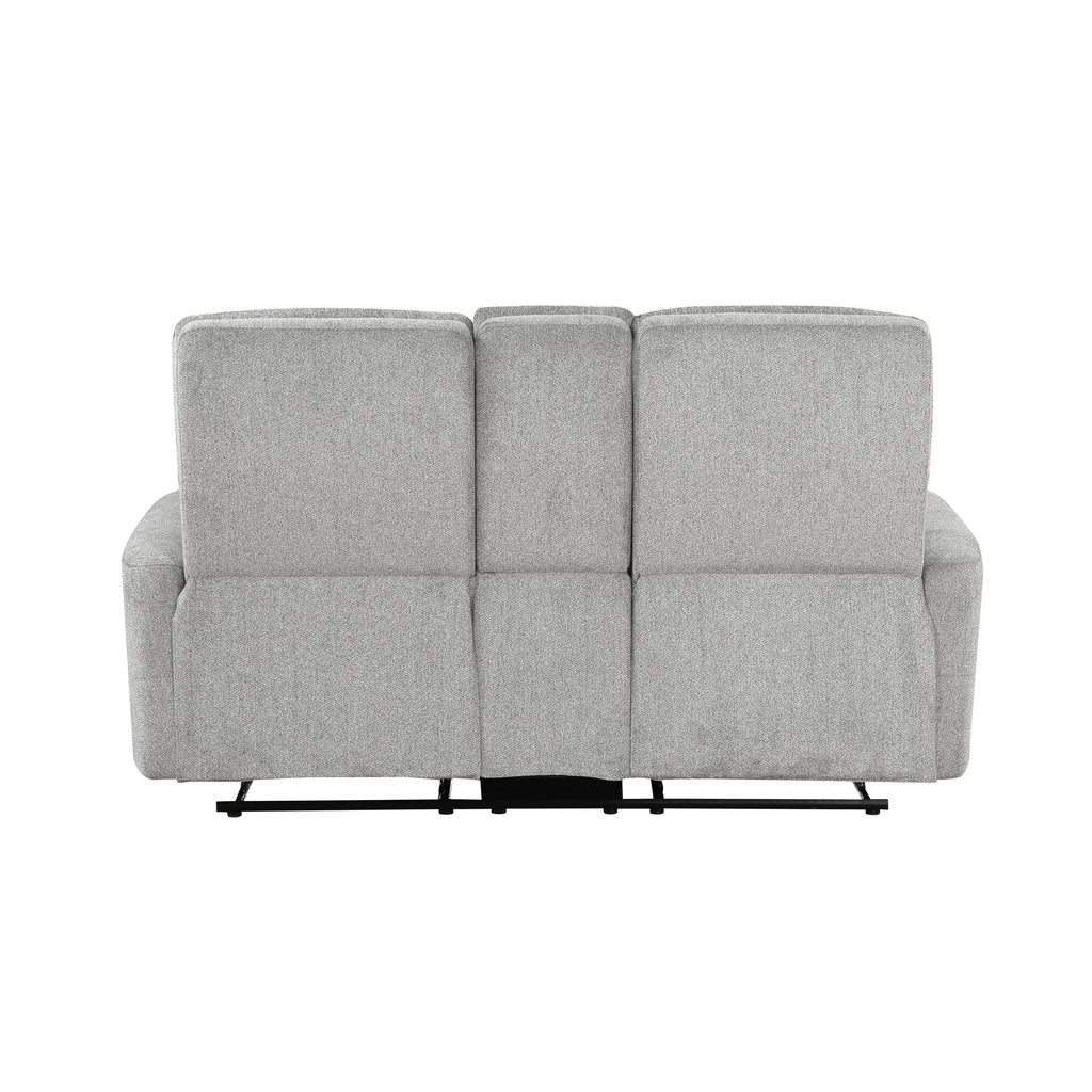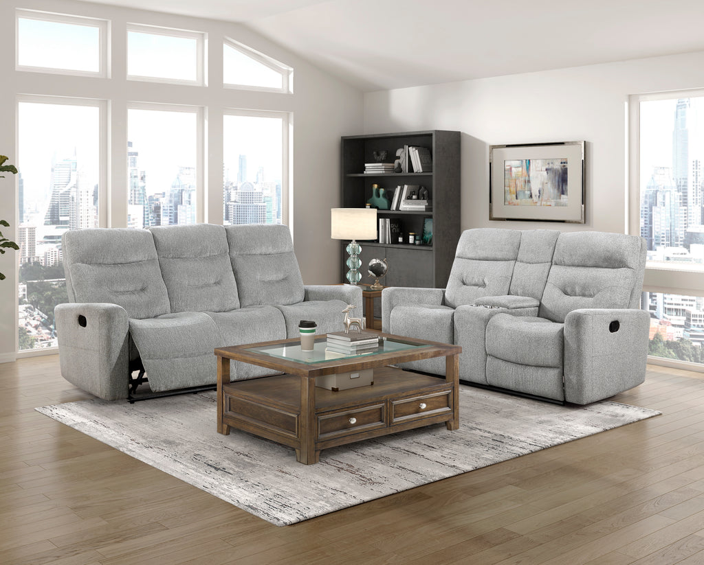 Your comfort is at hand in the design of the Lyndon Collection. The dual reclining ends of the love seat are engaged with a pull of the side-mounted tab. The love seat features a center console, with cupholders and hidden storage providing functional accent to your seated experience. Gray chenille fabric upholstery covers the plush, subtle modern framing, furthering your comfort, and serving as a neutral palette for your living room décor.