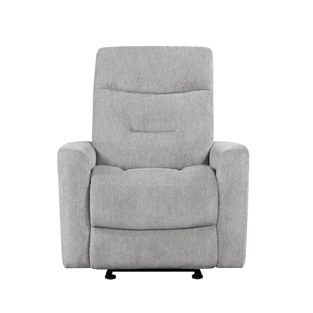 Your comfort is at hand in the design of the Lyndon Collection. The single reclining mechanism of the glider chair is engaged with a pull of the side-mounted tab. Gray chenille fabric upholstery covers the plush, subtle modern framing, furthering your comfort, and serving as a neutral palette for your living room décor.