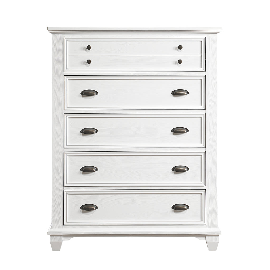 Bringing to mind lazy days at the beach, or peaceful afternoons in the country, the Mackinac Collection’s charming aesthetic pairs to your home’s classic décor. The traditional framing of the collection is covered in a white finish, its bright hue a refreshing addition to your bedroom. The knob and cup pull hardware of the chest features an antique brass finish, providing complementing contrast, and charming accent, to the white finish of the collection.