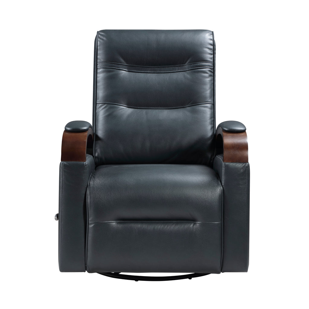 Indulge in unparalleled comfort with this faux leather recliner, meticulously designed for ultimate relaxation. Sink into plush foam padding over supportive pocket coils, while the breathable faux leather upholstery ensures a luxurious feel. With an easy-to-use manual pull-handle reclining motion, gentle gliding, and a 360-degree swivel, this chair offers versatile movement for your ideal lounging position. The elegant solid rubberwood arms in a light brown finish add a touch of sophisticated style, making this recliner a perfect addition to any living space.